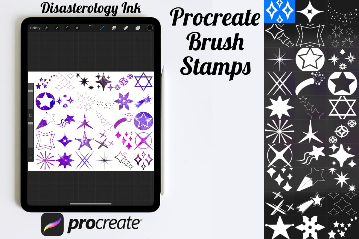 Pack of 30 sparkling star Procreate Stamp Brushes! These 30 unique star stamps are perfect for making illustration projects or any procreate purpose. You can use these in any colour or opacity and they can be resized to best fit your art. You need Procreate 5.0.8 or 5X, an iPad, and an Apple Pencil. Also, these stamp brushes are not pressure sensitive and can be used with third party stylus, Apple Pencil or even your finger. You can change the colour, size and opacity of these stamps.