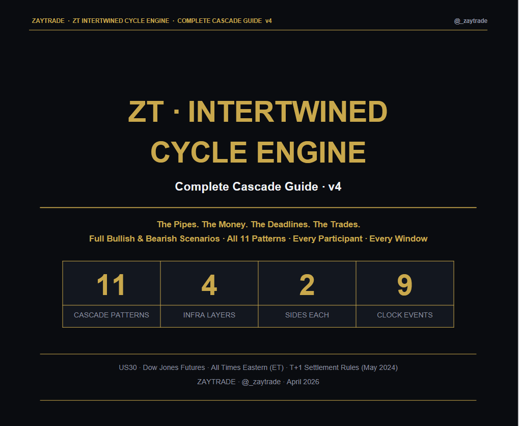 The ZT Intertwined Cycle Engine™ is a professional-grade trading framework designed to decode the real mechanics behind market movement — not by predicting price, but by tracking institutional obligations, settlement flows, and time-based execution windows.