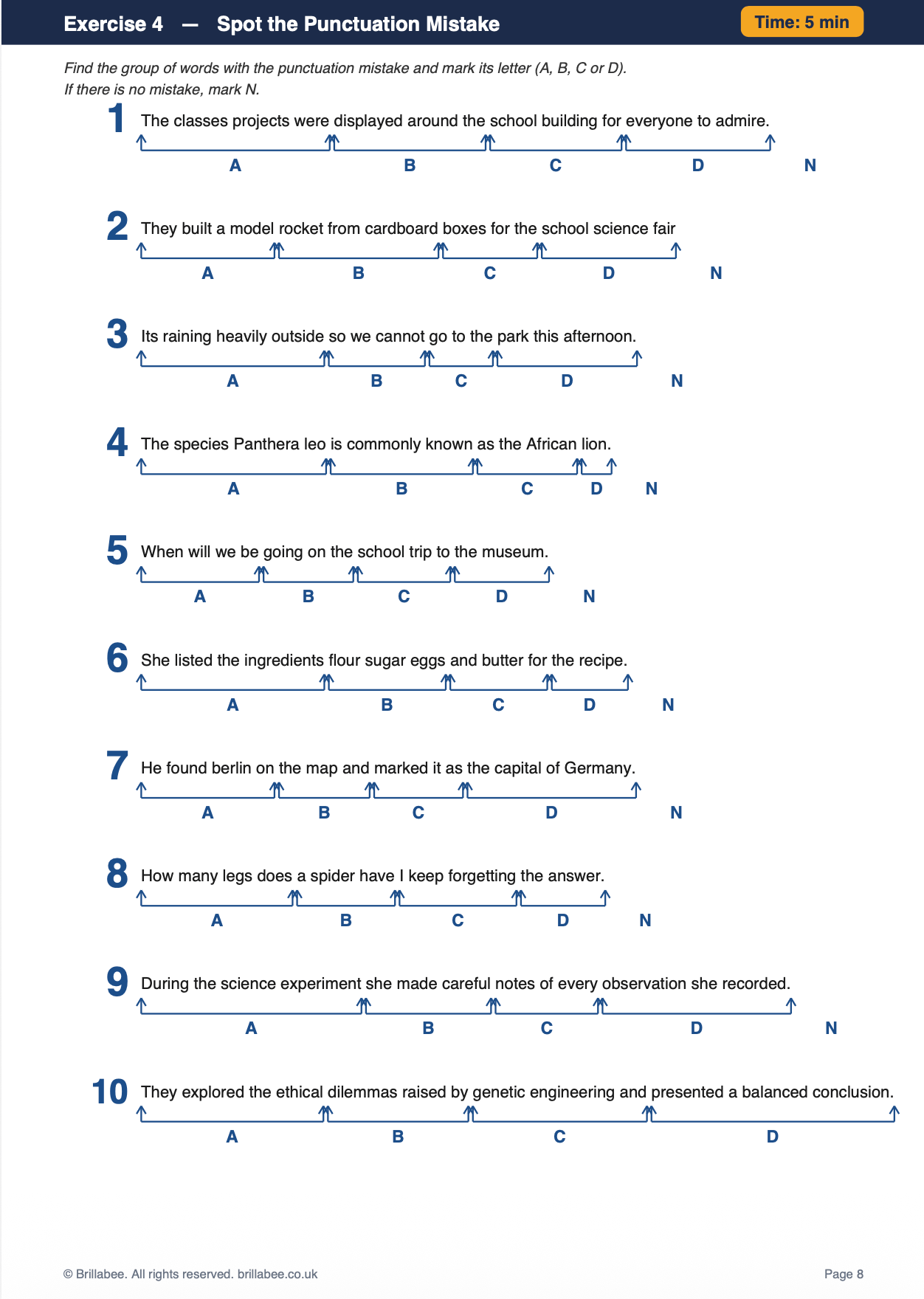 Includes "no mistake" (N) questions so children learn to distinguish real errors from correct sentences