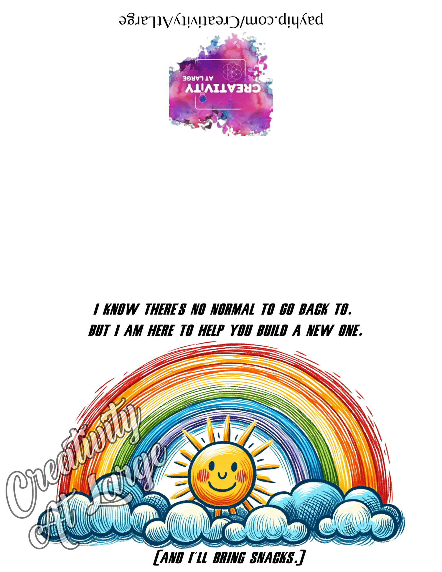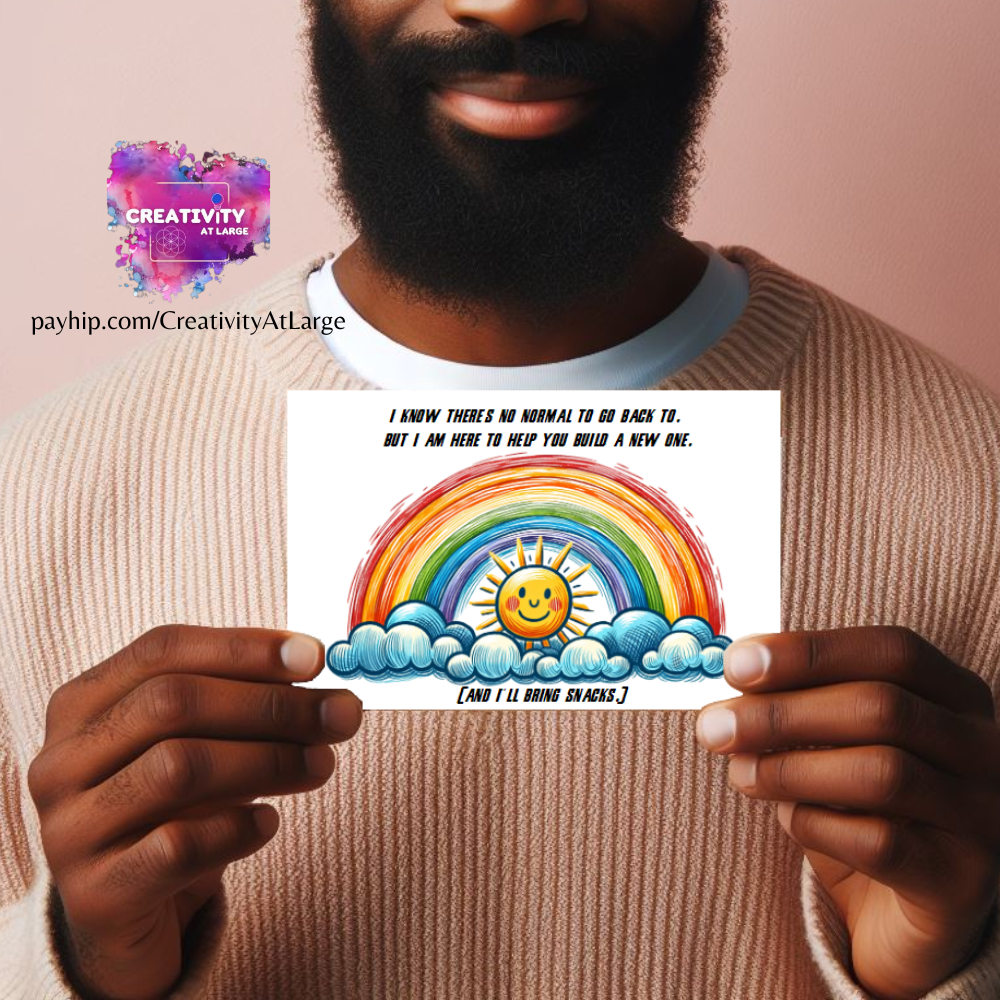 In the midst of grief and loss, where 'normal' ceases to exist, extend a hand of support with our heartfelt greeting card. It reads, 'I know there is no normal to go back to. But I am here to help you build a new one. And I'll bring snacks.' This card acknowledges the long and challenging process of grief, offering comfort and understanding to those stuck in a fog of loss or dealing with chronic illness. It's a reminder that while the world moves on, your support remains steadfast. Printed on an 8.5 x 11 inch paper and designed to fold into a 5.5 x 4.25 inch horizontal card, it provides ample space for your own personalized message inside. This card is more than just a gesture; it's a promise of ongoing support and companionship during the toughest of times. Perfect for anyone experiencing ambiguous, unresolved loss, or chronic illness, it's a way to say, 'I get it, and I'm here for you.' The digital download format allows for convenient printing at home or a local print shop, ensuring you can reach out with this meaningful message whenever it's needed.