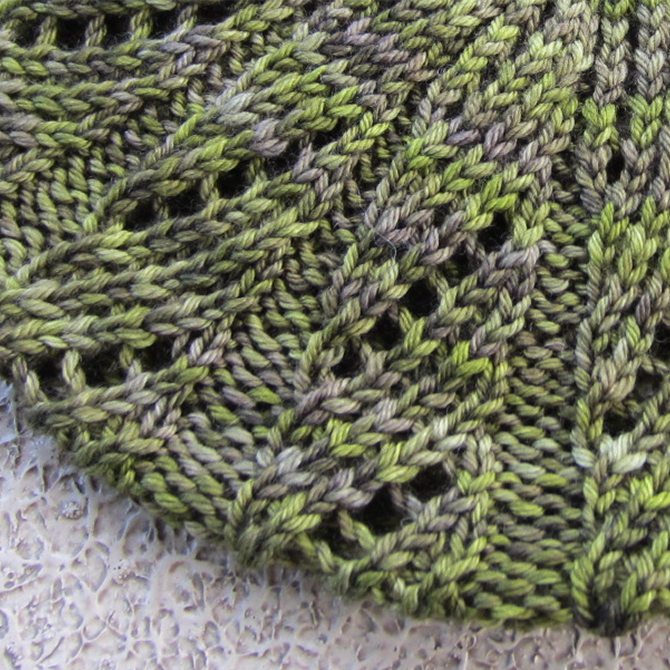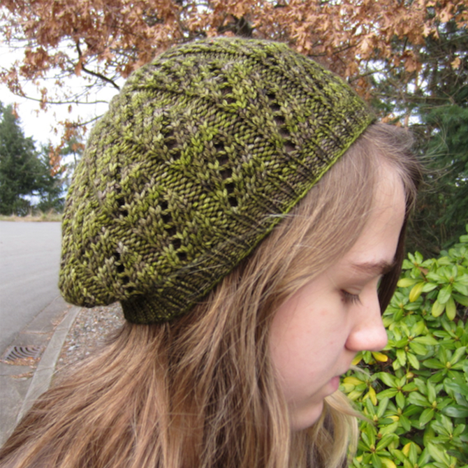 Skills required: Knitting in the round, increasing, knitting lace (k, p, k2tog, yo, RT), blocking a beret.