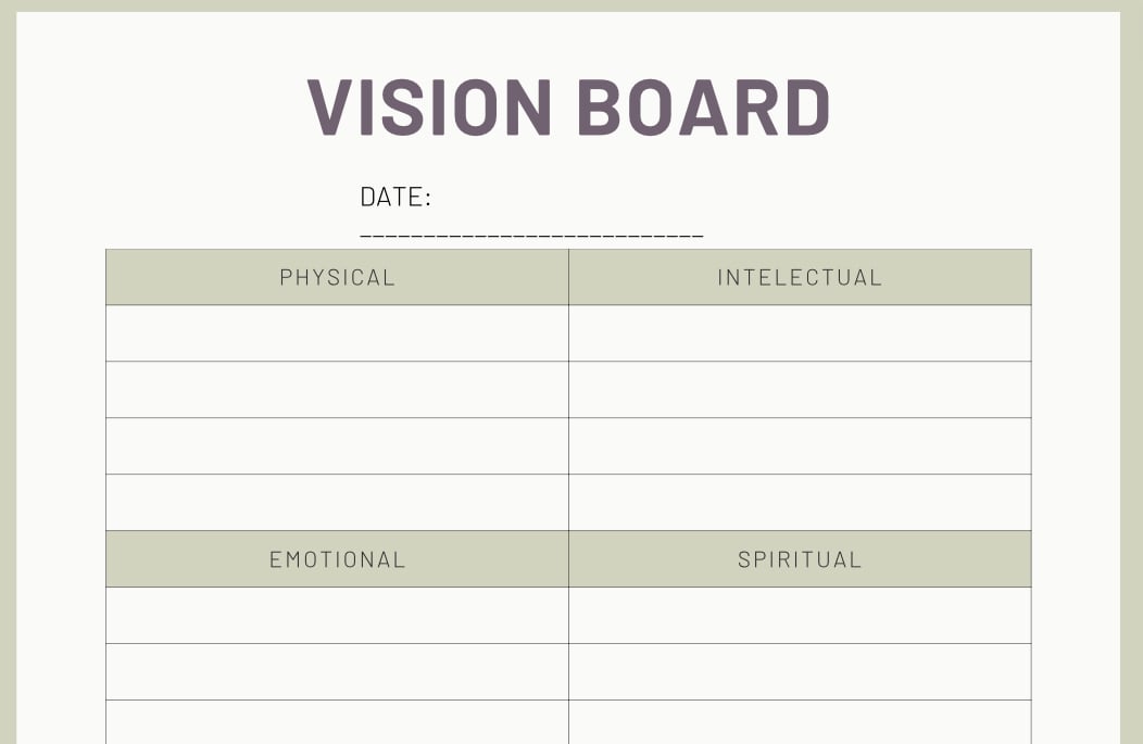 A PDF printable download that allows you to organise your vision for your future across a variety of themes, from personal to health, from financial to work