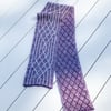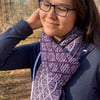 This scarf uses Fission Knitting to create a different design on each side of the fabric. The result is cables overlaid on top of a marled garter stitch middle layer. Two fingering weight yarns are held together to create a worsted weight scarf.