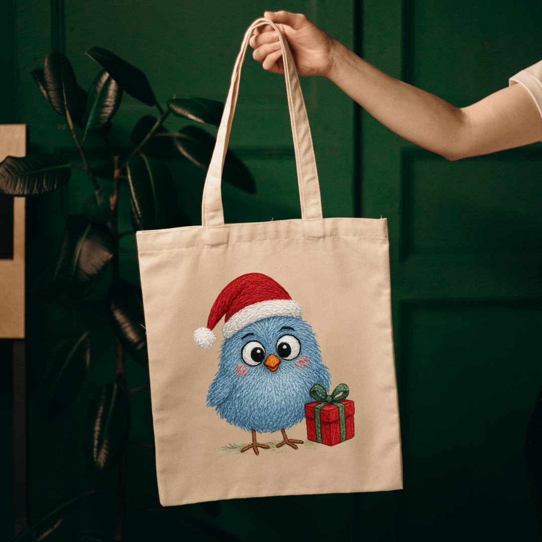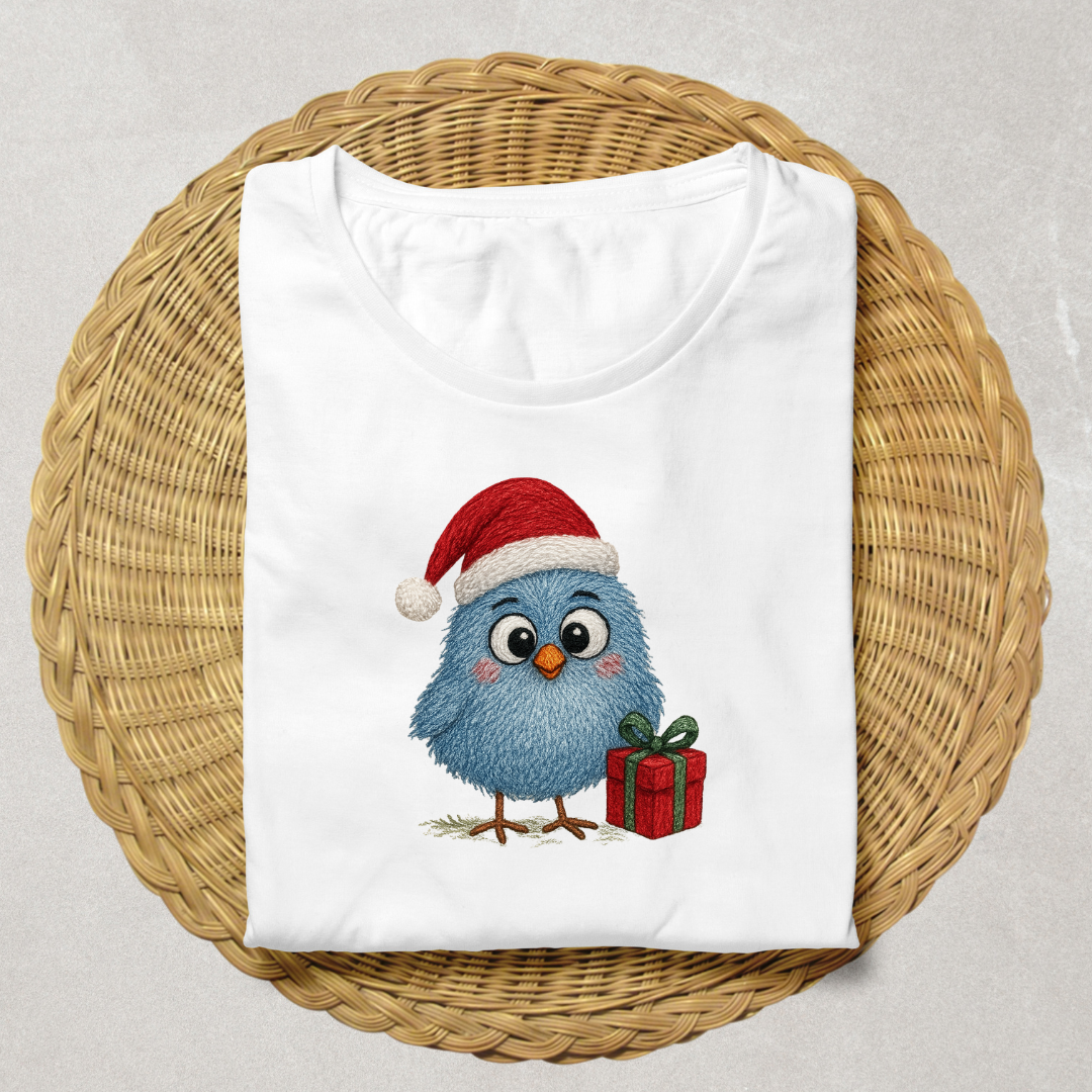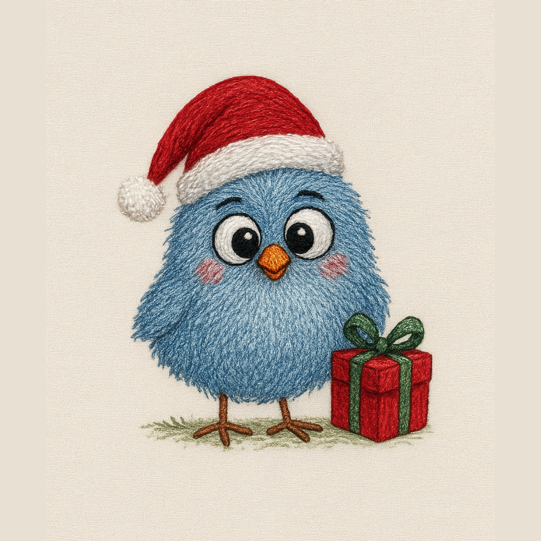 Cute Christmas Bird Embroidery Design β Blue Chick with Santa Hat & Gift