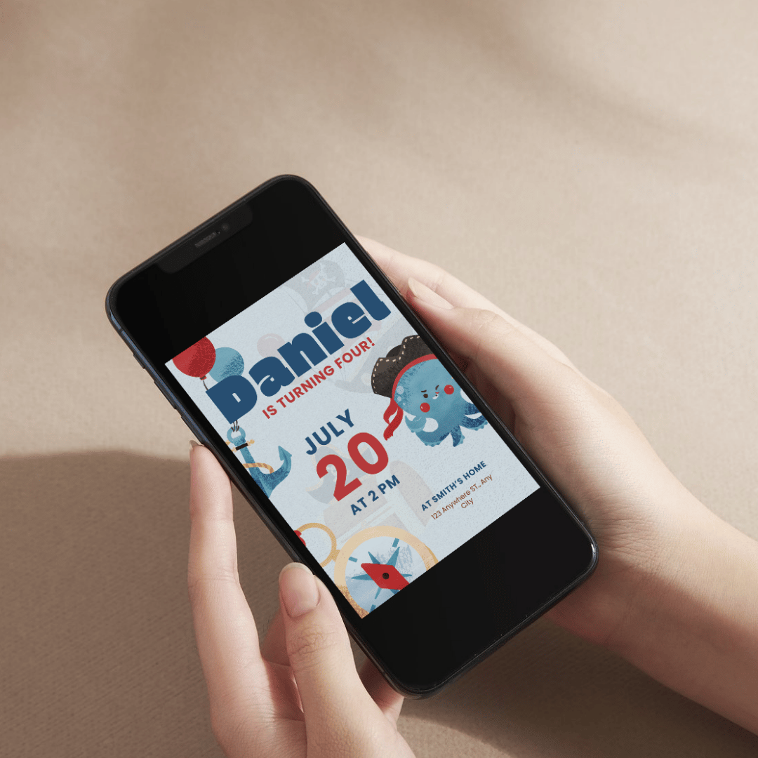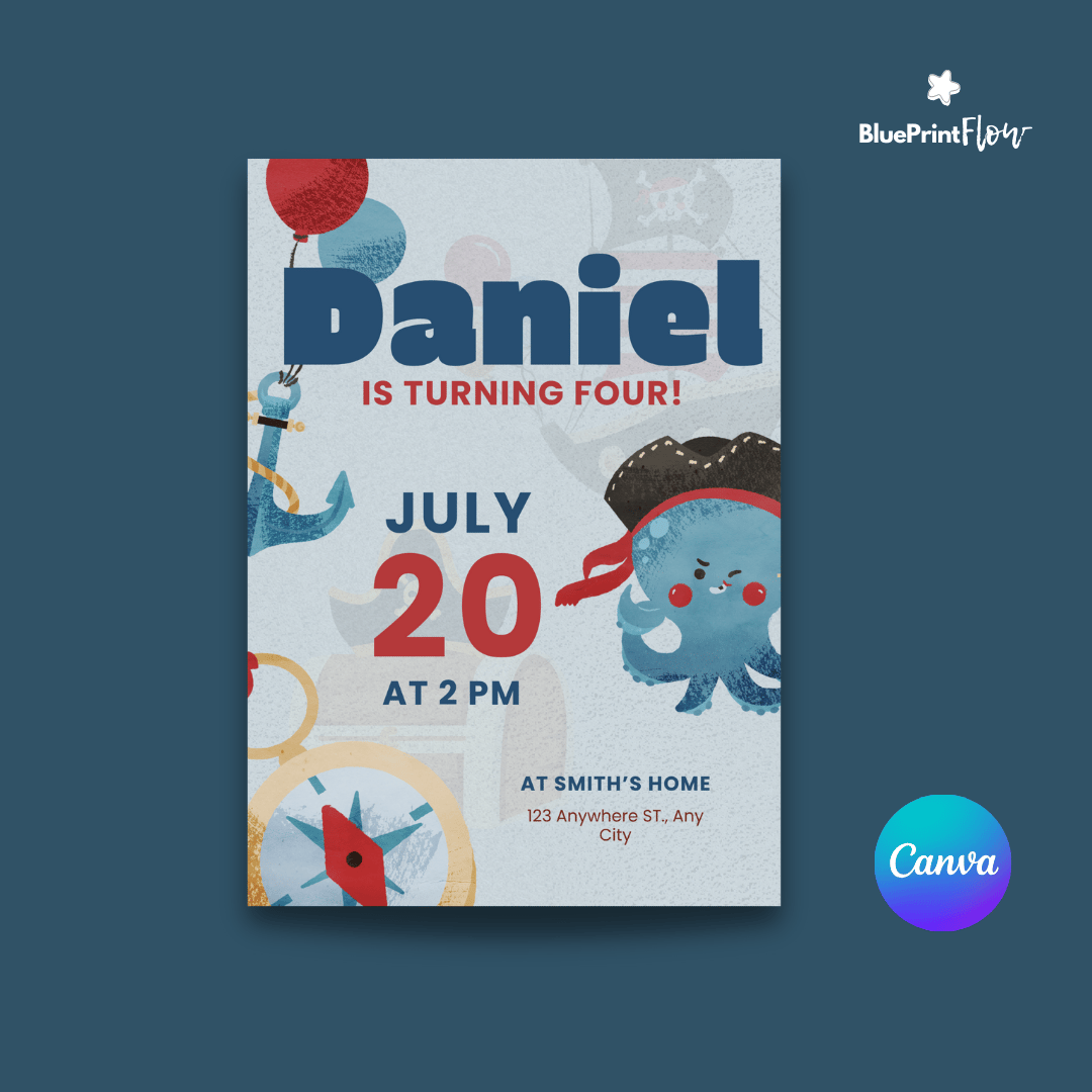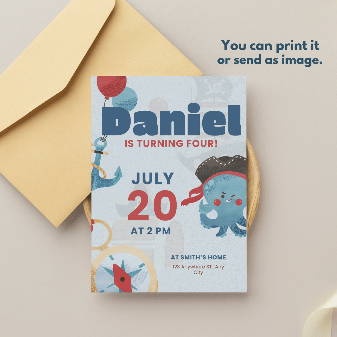 Featuring a playful design with cheerful animated elements like a smiling pirate octopus, anchors, balloons, and a compass, this editable Canva template is perfect for a fun and festive celebration.