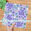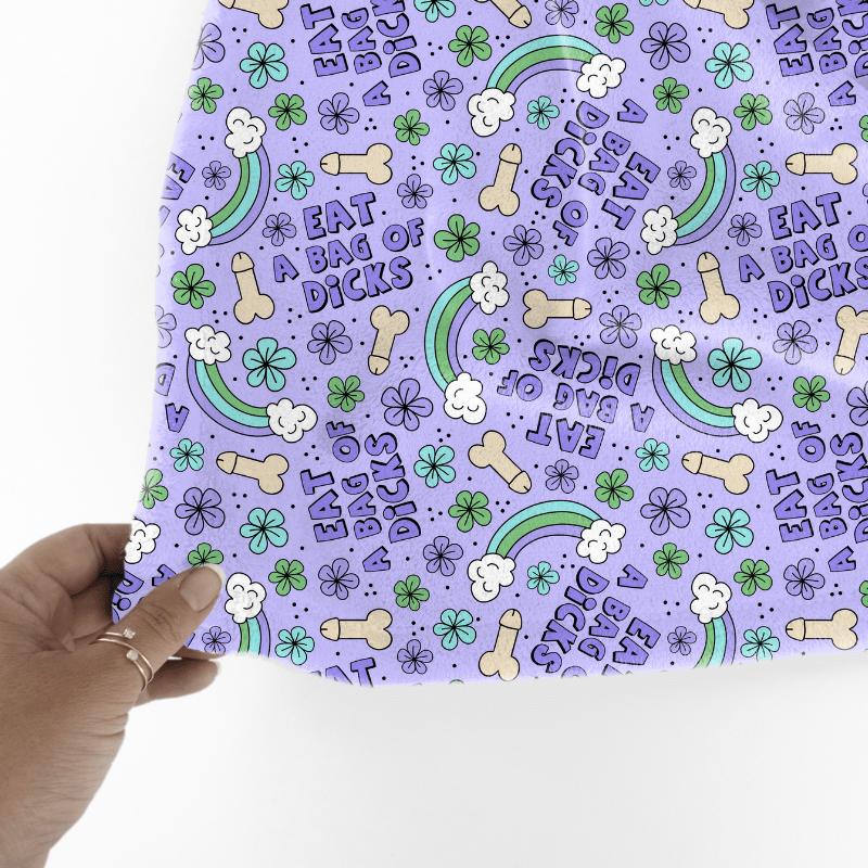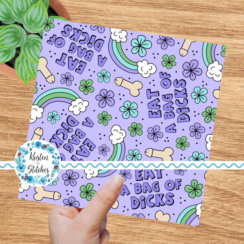 Eat a Bag of Dicks with rainbows and flowers on purple.