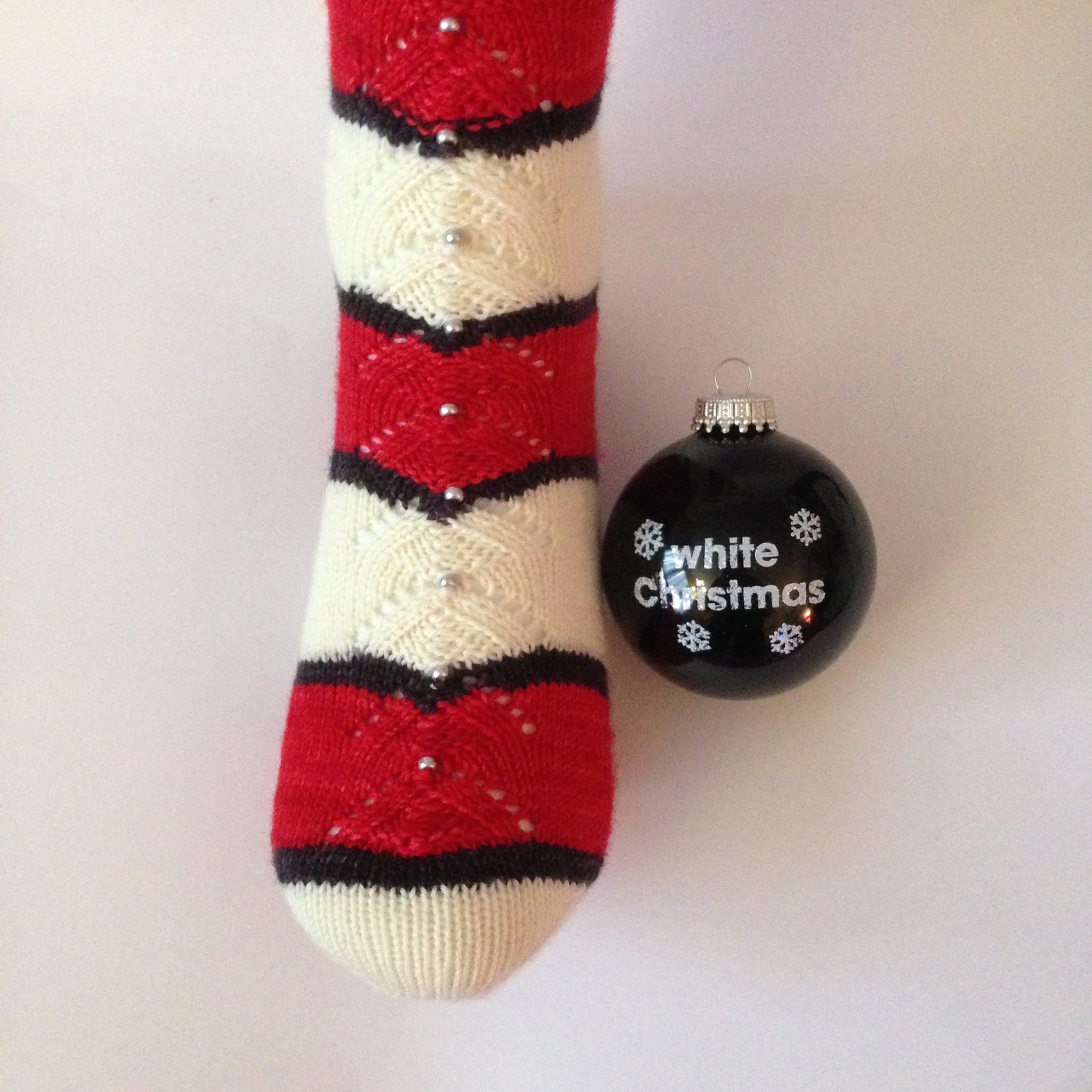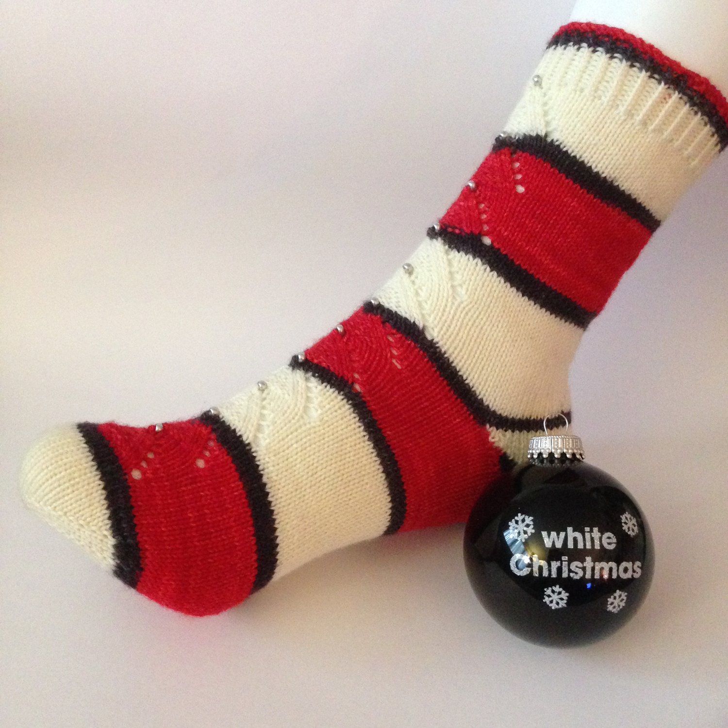 These socks are inspired by the final number with the actors in Santa suits, beautiful ballerinas, and all manner of Christmas beauty. These toe-up socks have a simple lace Christmas tree motif. There is an optional bead that can be placed at the tip of each Christmas tree.