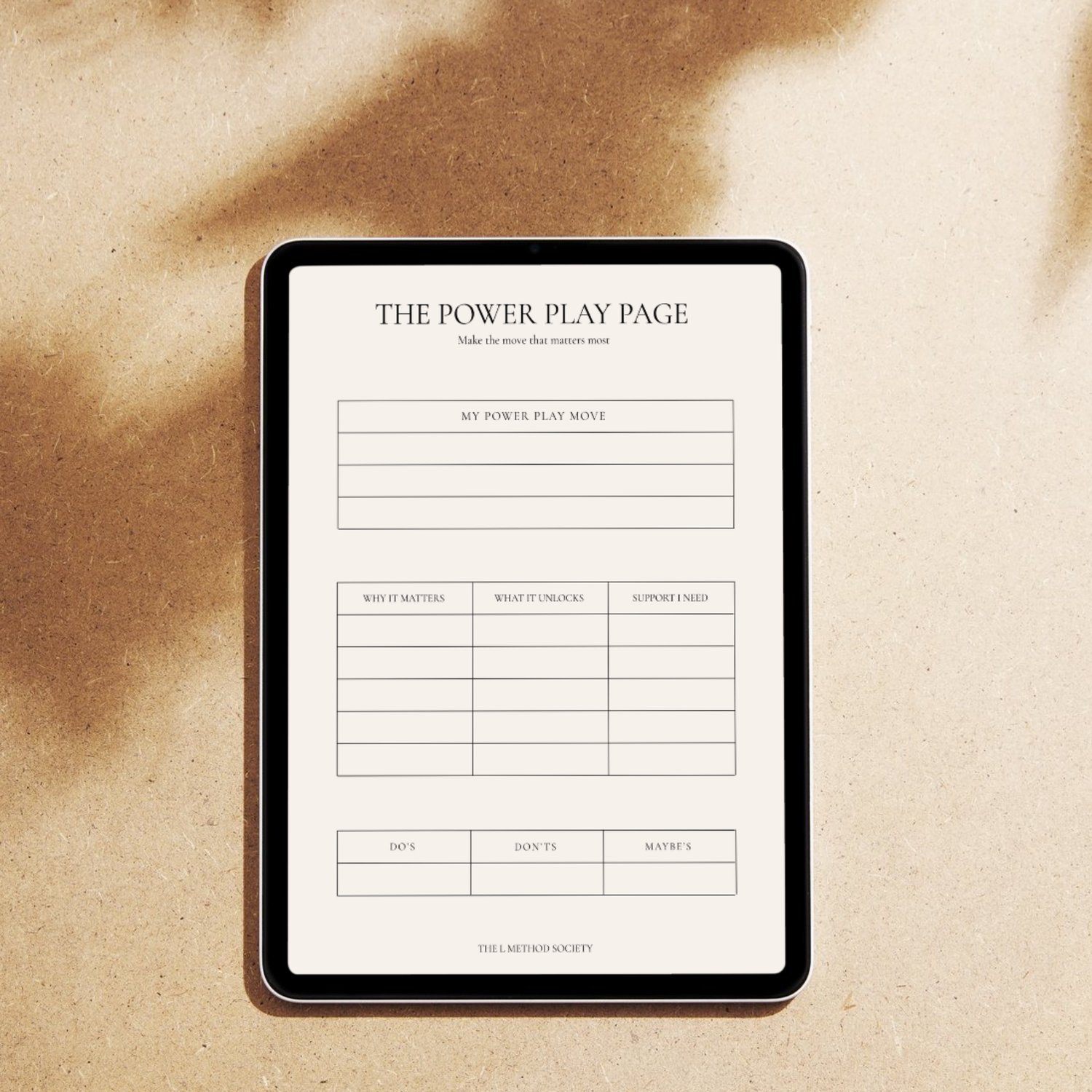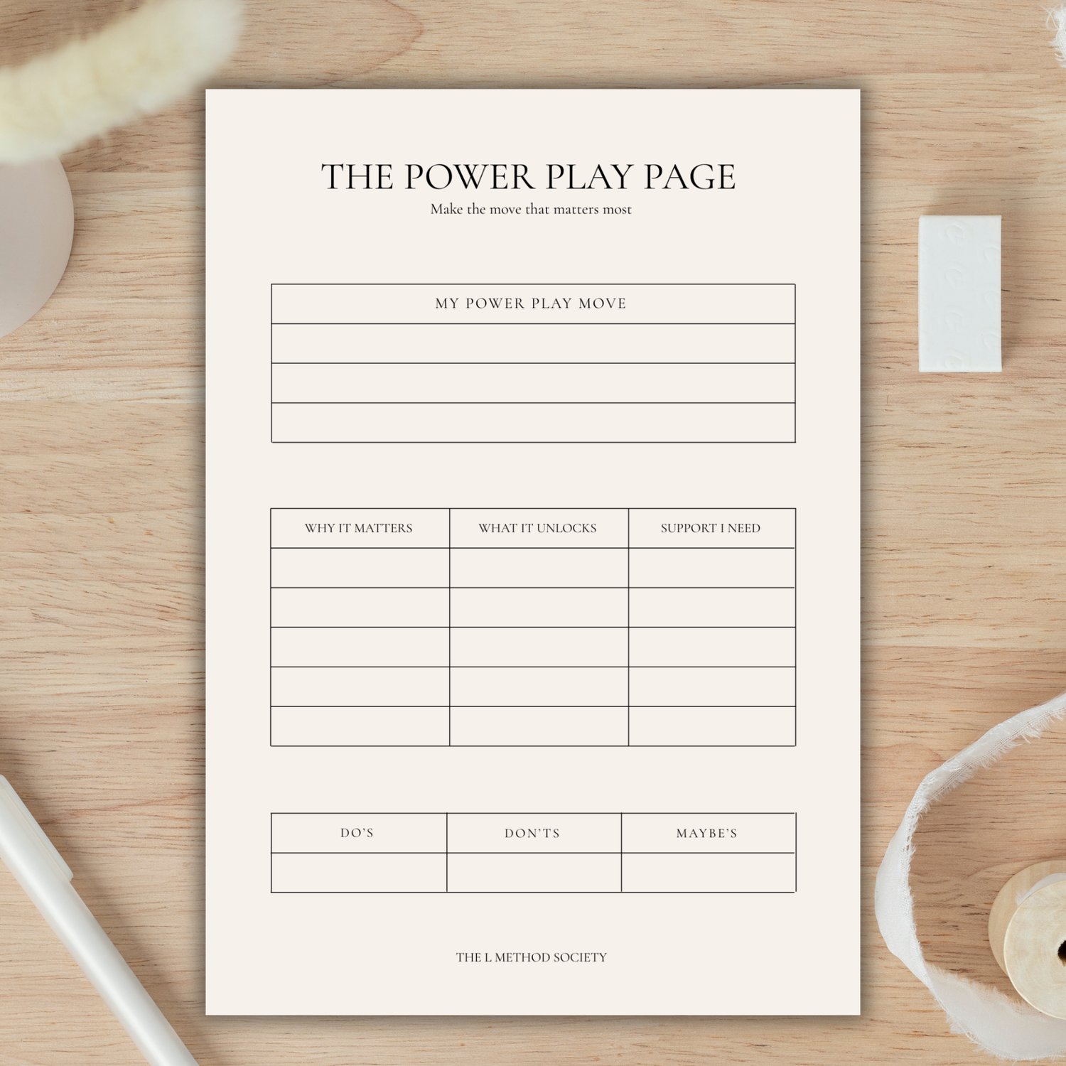 Make your boldest moves with the Power Play Page – an editable, printable PDF designed to help you map out strategic actions and track the results of your strongest decisions.