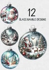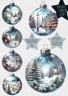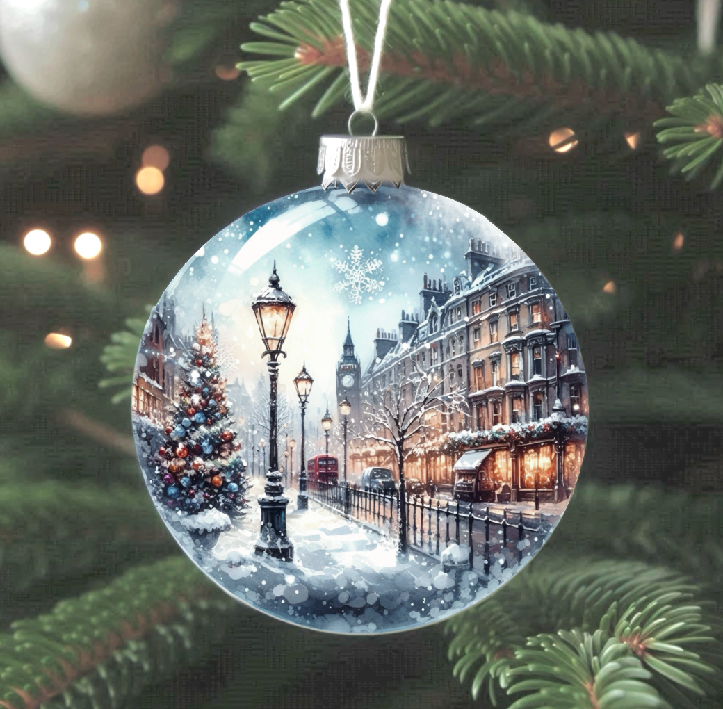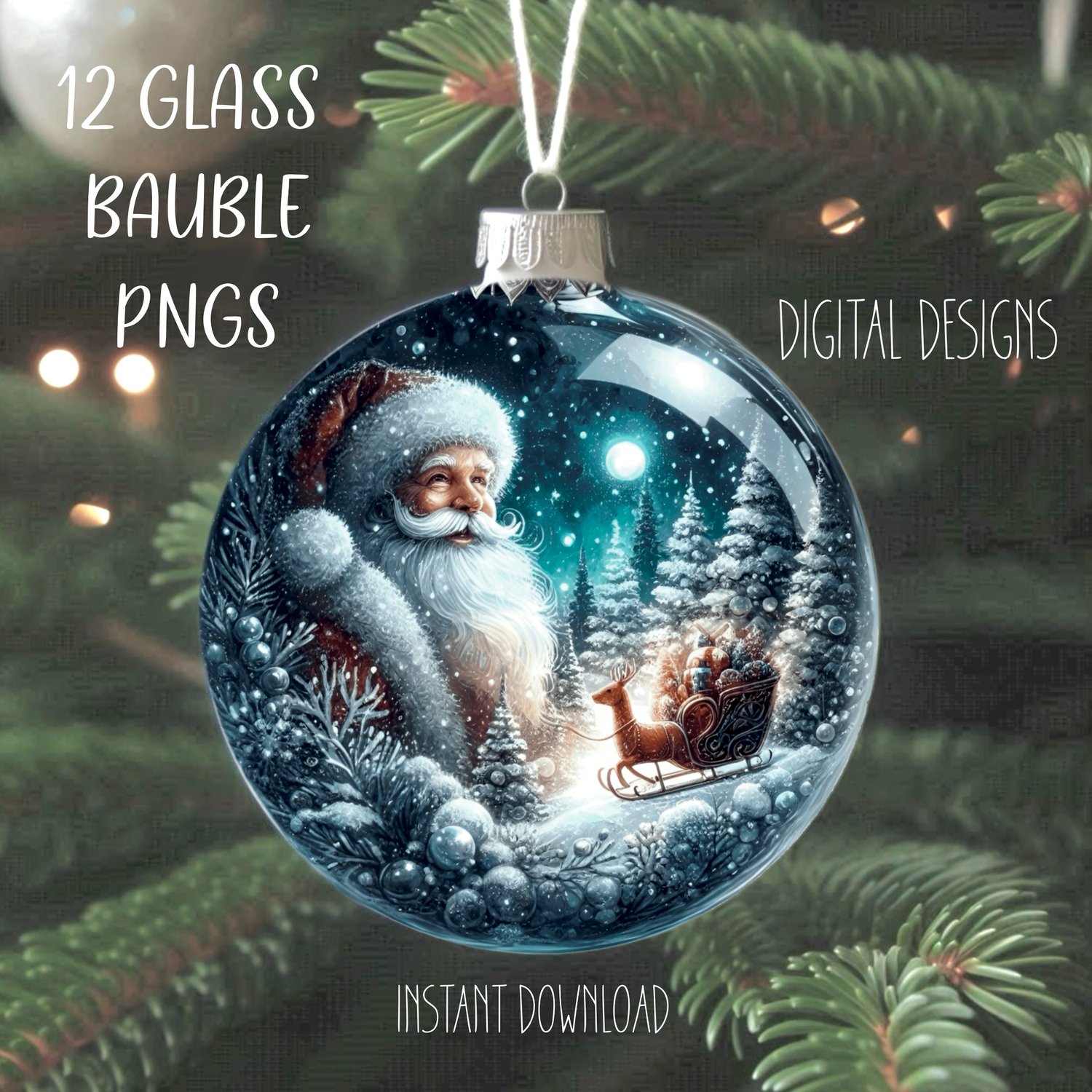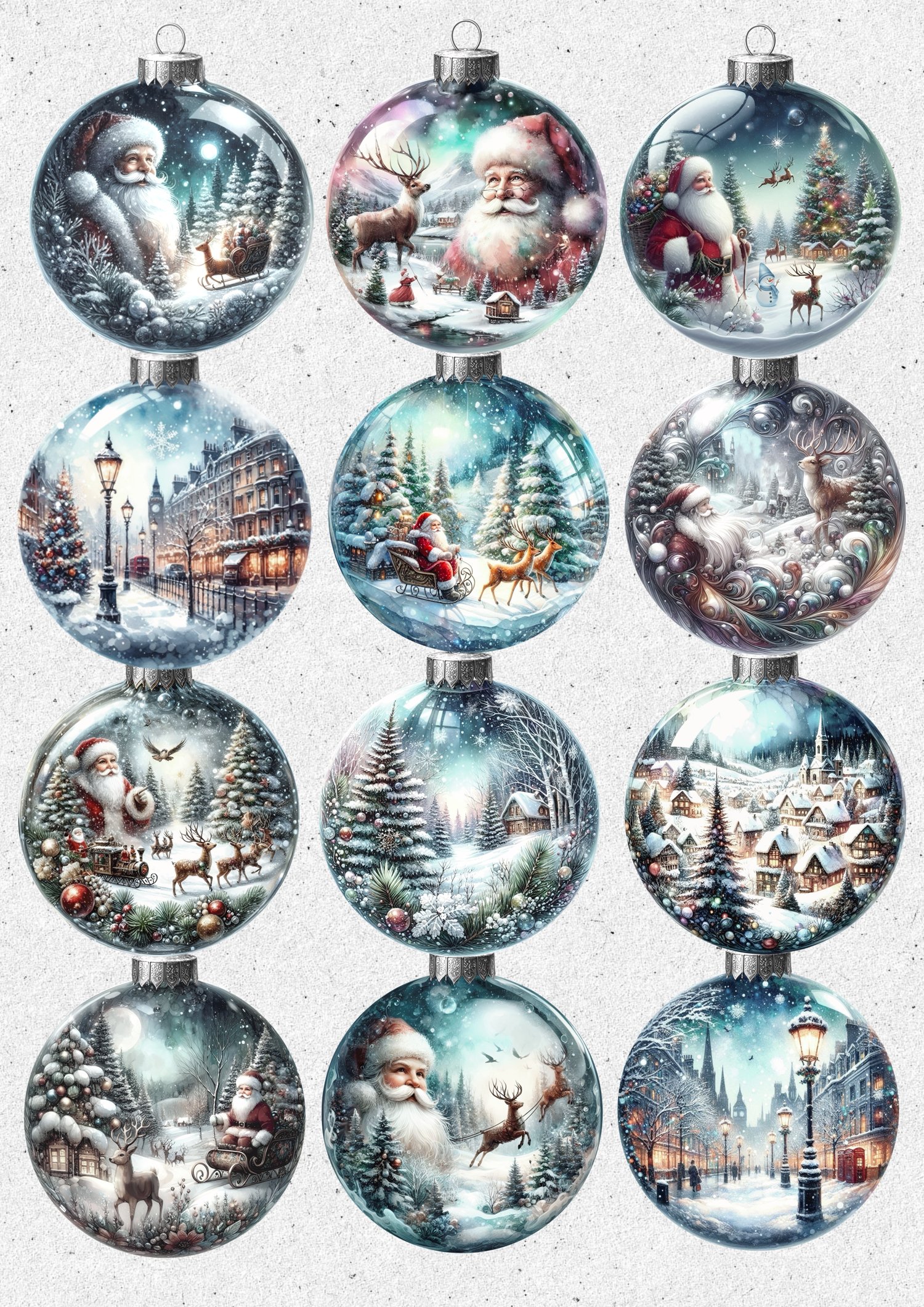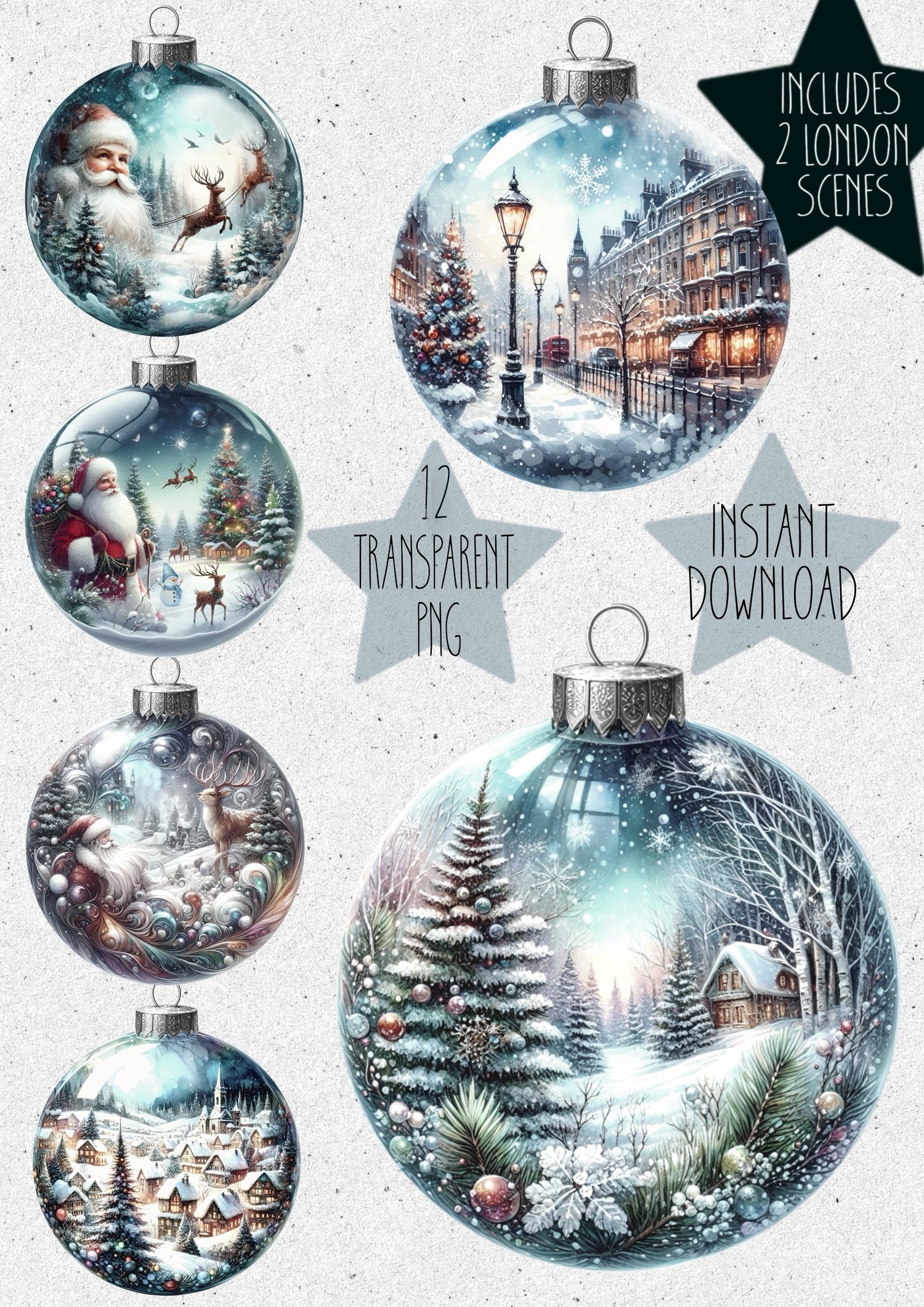 Elegant Christmas glass baubles design, 12 PNGs, Santa, Christmas Village and 2 London scenes. Sublimation, print. Instant download.
