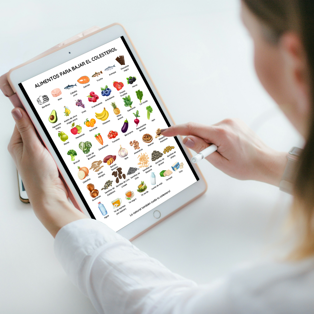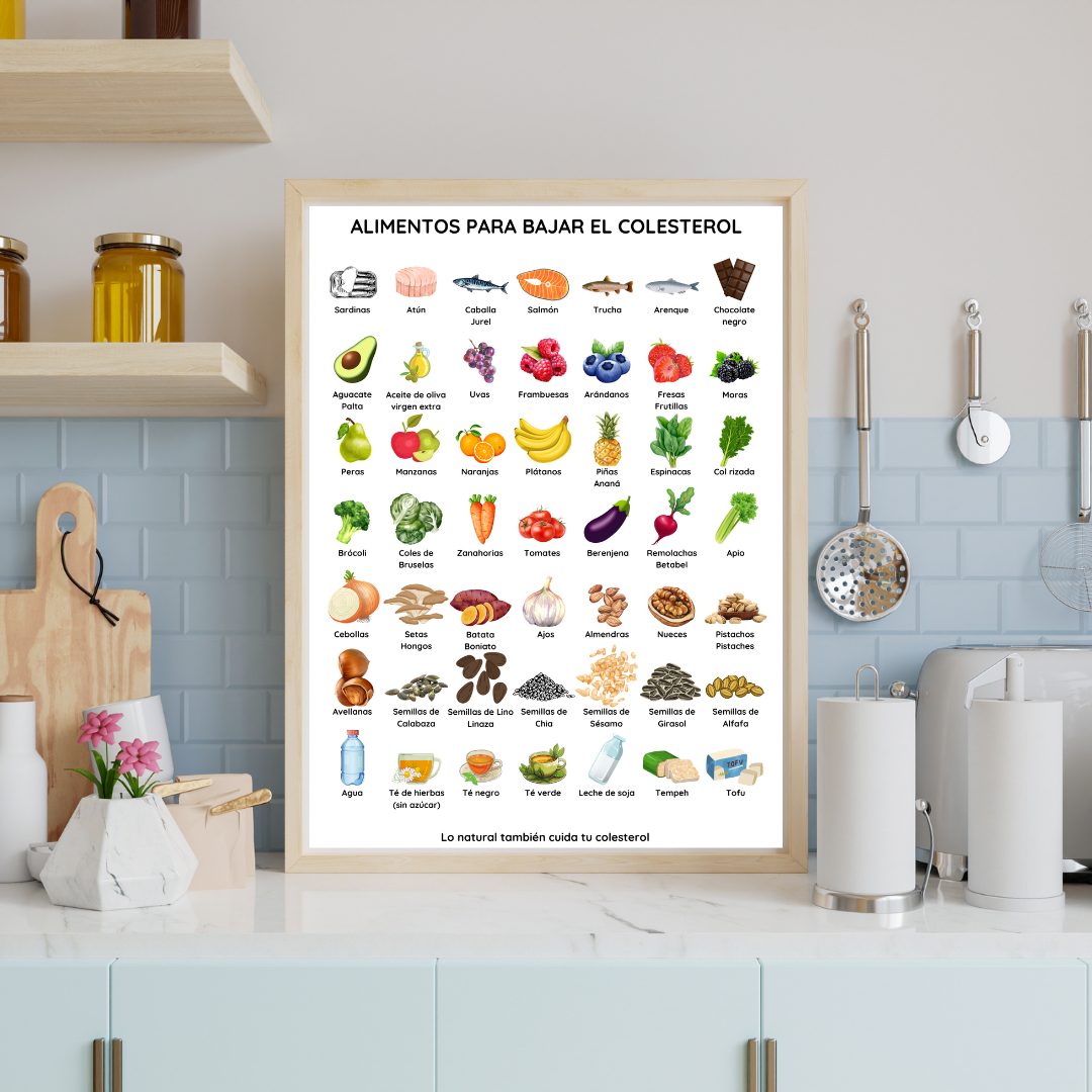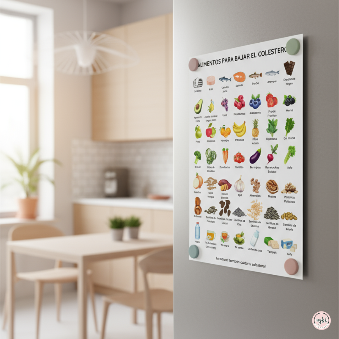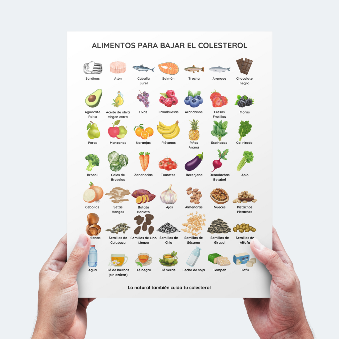 Esta lista colorido y fácil de leer muestra más de 49 alimentos que ayudan a bajar el colesterol de forma natural. Ideal para colocar en la cocina, en una consulta nutricional o como material educativo, esta guía te motiva a tomar decisiones saludables cada día.