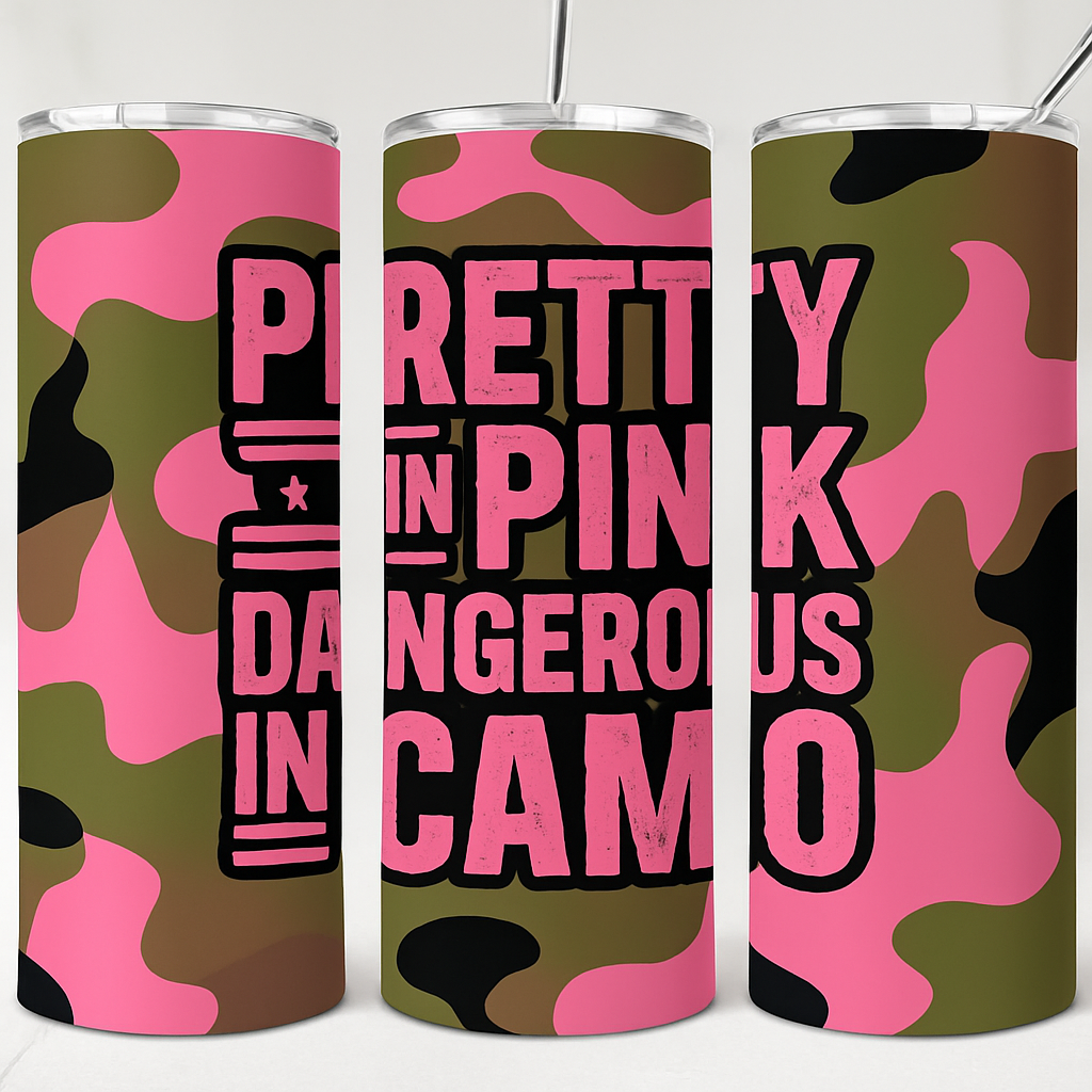 20 oz Sublimation Tumbler Transfer – “Pretty in Pink, Dangerous in Camo”