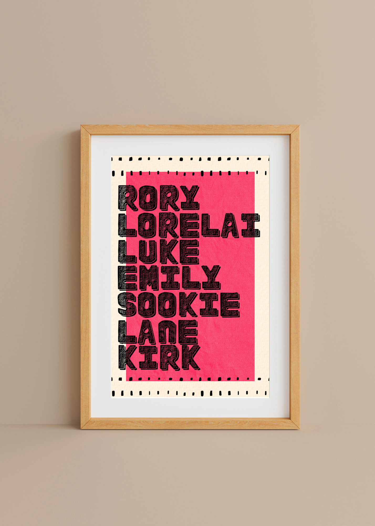 Stars Hollow Cast— Set against a bright pink backdrop bursting with personality, this original design is a joyful homage to the unforgettable cast of Gilmore Girls. Featuring the names—Rory, Lorelai, Luke, Emily, Sookie, Lane, and Kirk—each letter dances in a fun, funky font, echoing the charm and quirk of the show’s beloved world. Bold, cheerful, and full of heart, this print is a vibrant celebration of the characters who made Stars Hollow feel like home.