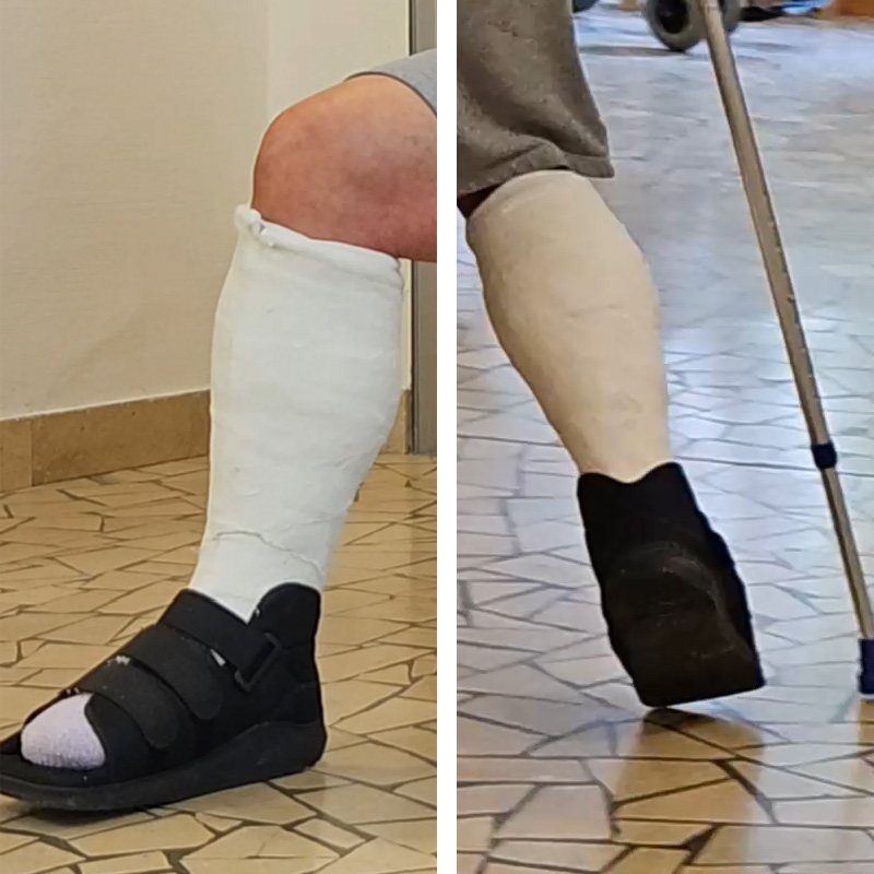 Here we meet an older gentleman who walks briskly through the entrance area of an Austrian hospital and, still leaning a little on his crutches, makes his way directly to the cast room with his walking cast.