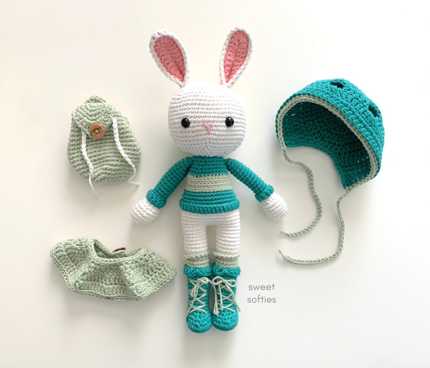 The Wanderlust Bunny is a fun amigurumi rabbit doll that loves to travel and explore the world. She wears a sweater, knee-high socks, tall boots, and has several removable accessories, including a hood, skirt, and backpack. This toy is perfect for kids and children who love dress-up and pretend play. The PDF pattern file includes complete, written instructions for the doll-making process and step-by-step explanations for finishing details.