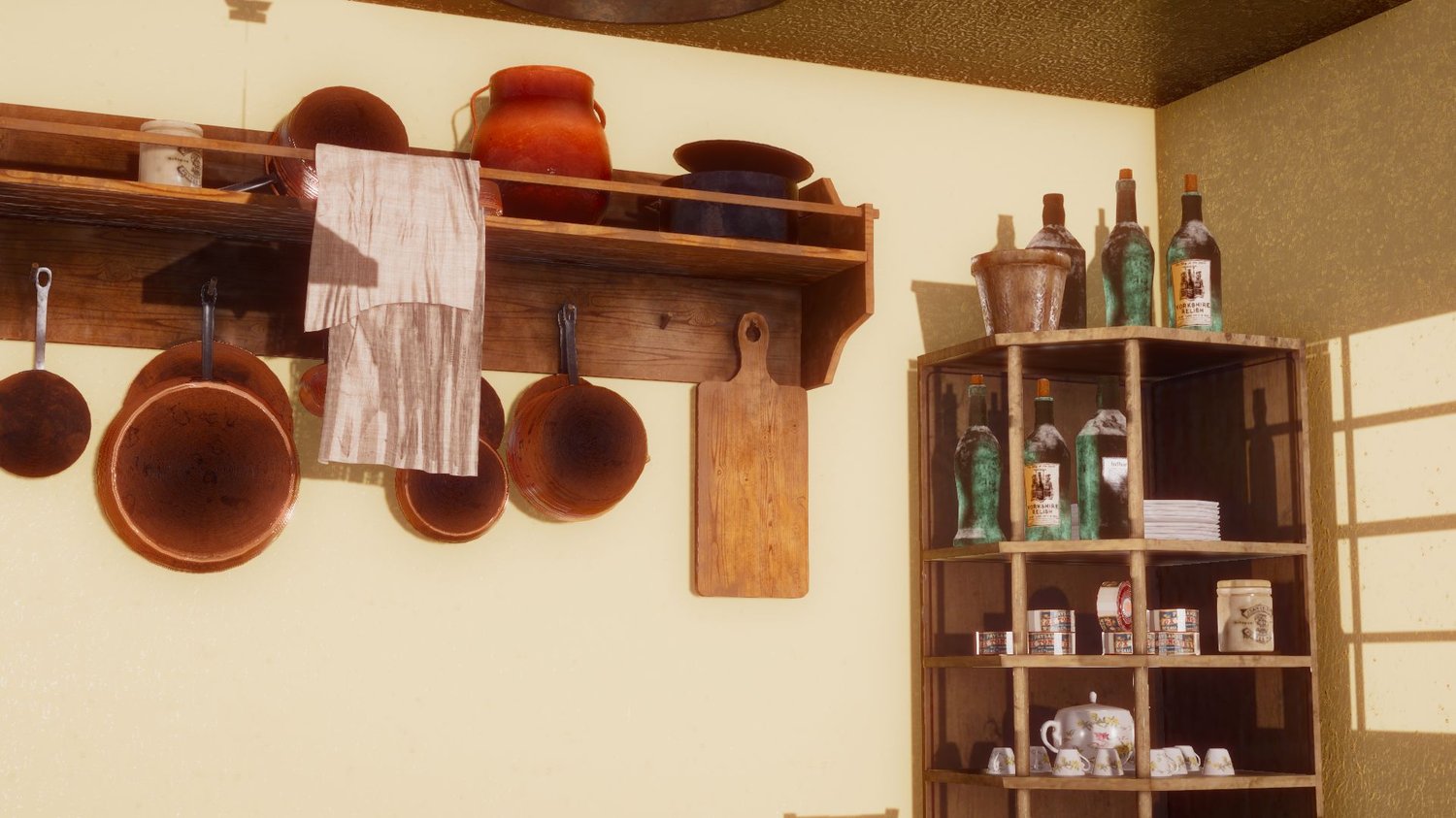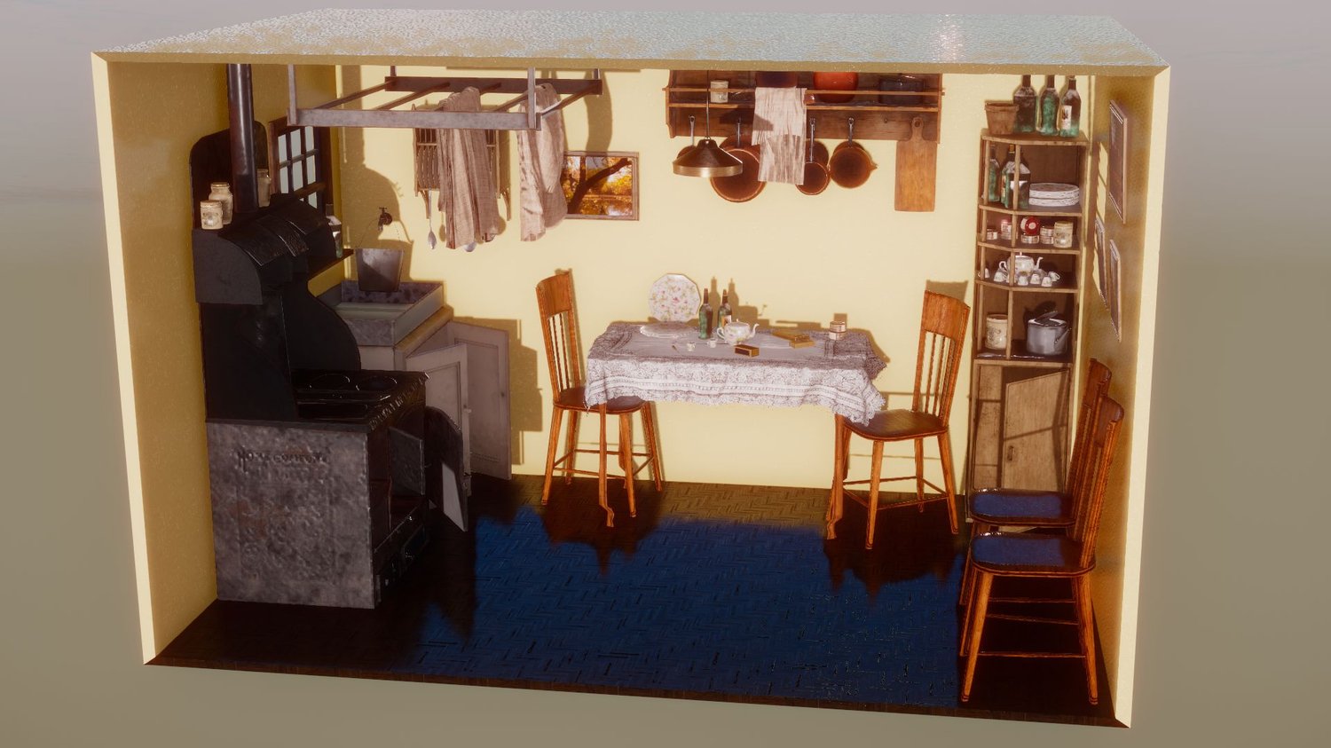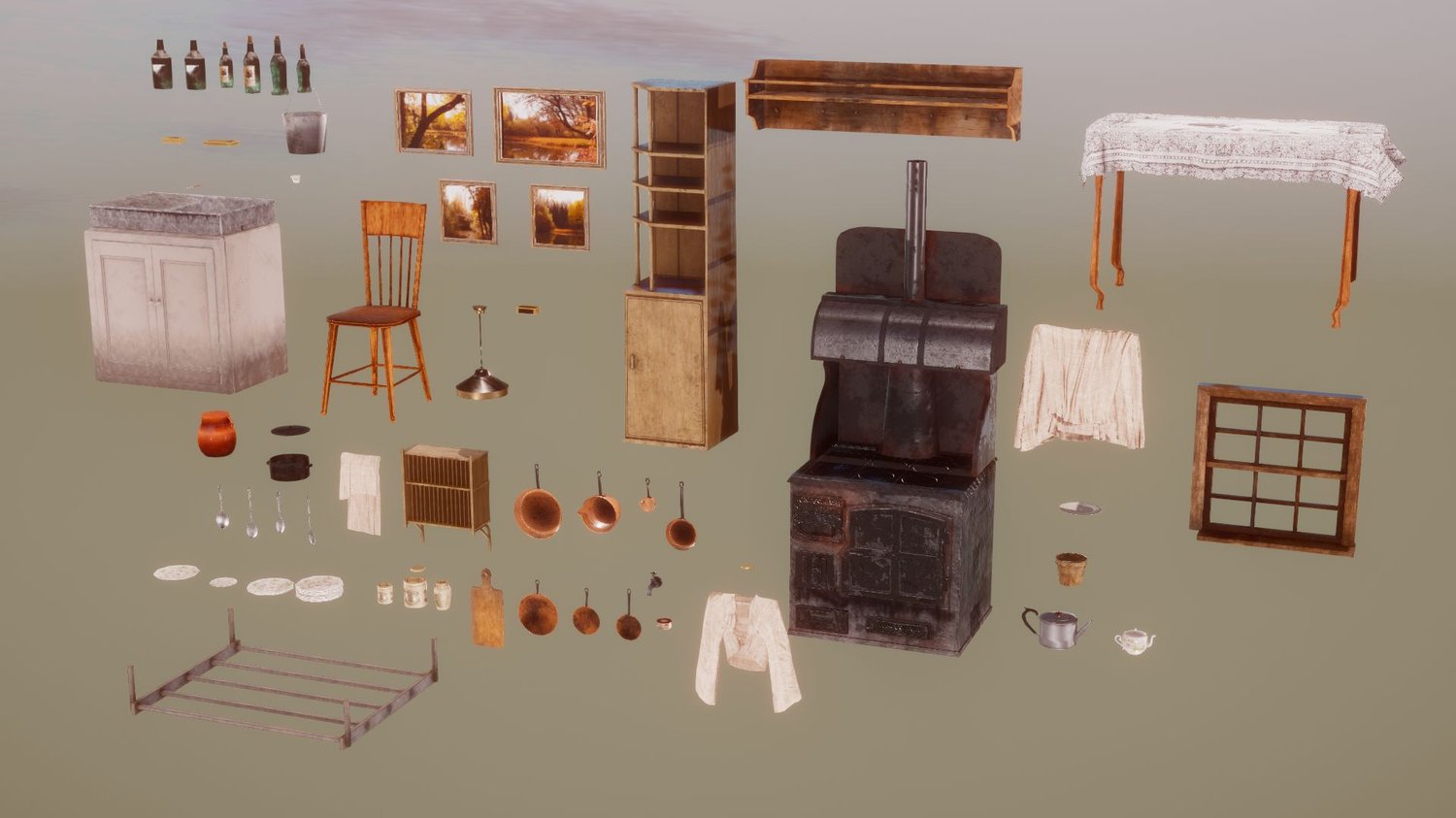 - Diverse Elements: Includes a variety of items such as an iron stove, table with lace tablecloth, wooden chairs, shelves with dishes and jars, and more. These elements allow complete customization of the environment according to your creative needs.