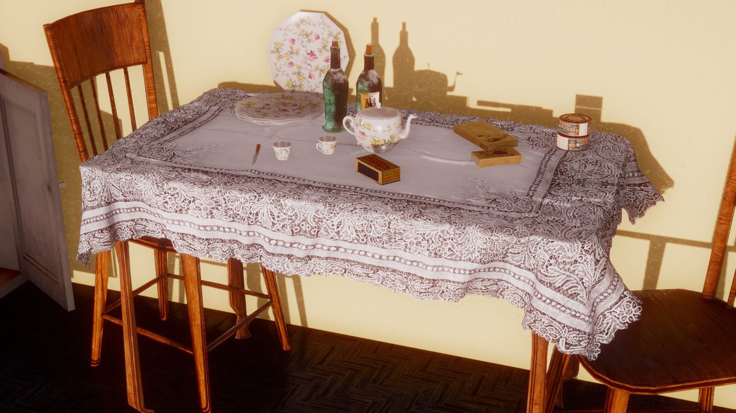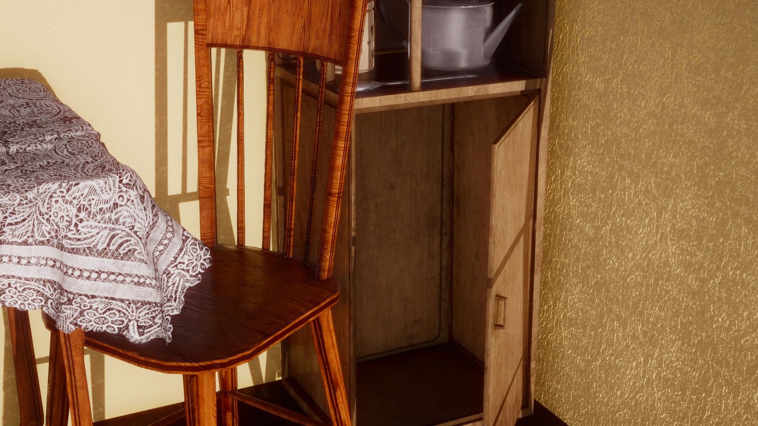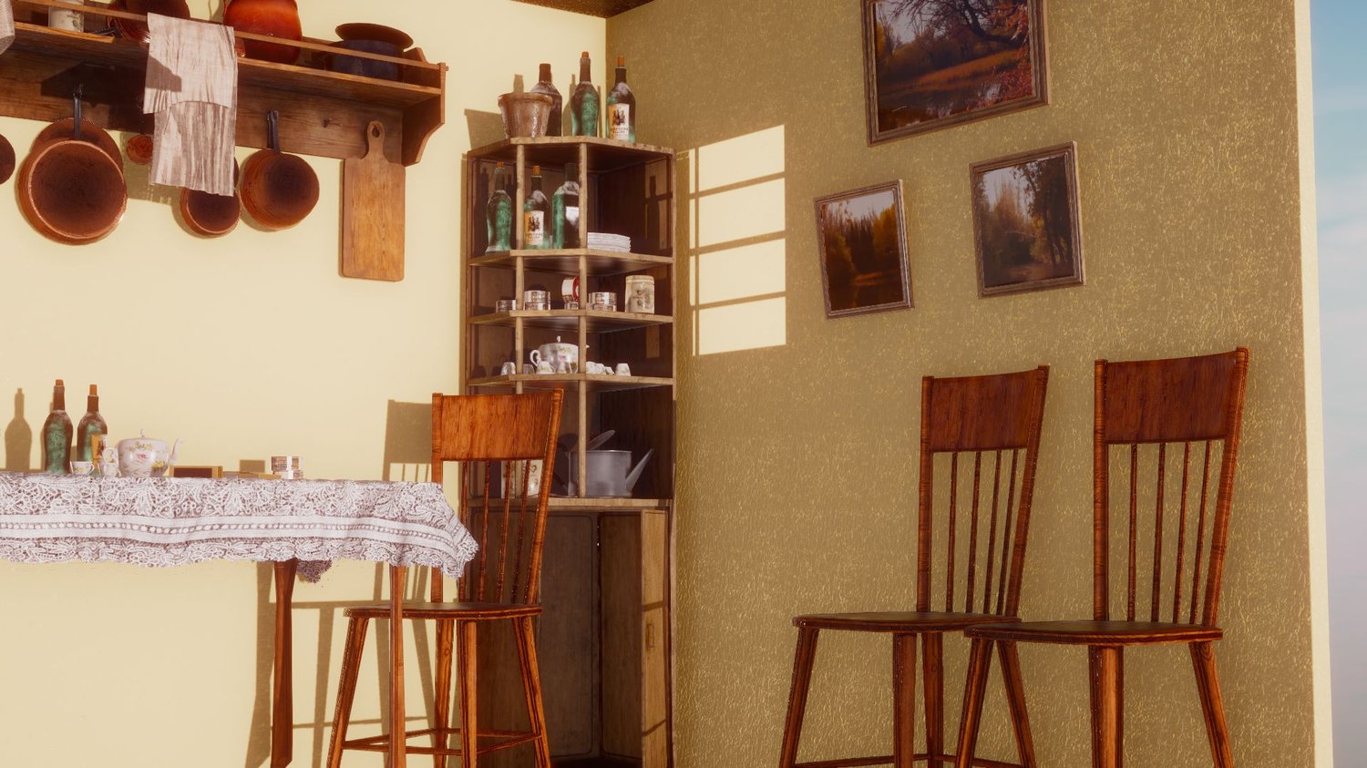 - Diverse Elements: Includes a variety of items such as an iron stove, table with lace tablecloth, wooden chairs, shelves with dishes and jars, and more. These elements allow complete customization of the environment according to your creative needs.