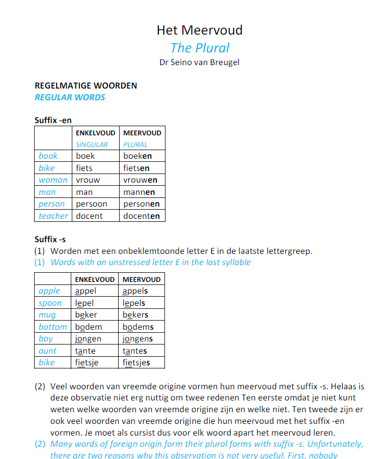 - Een grammatica-overzicht (4 pagina’s) met een uitleg over de Nederlandse meervoudsvormen van zelfstandige naamwoorden. Deze uitleg wordt zowel in het Engels als in het Nederlands gegeven.