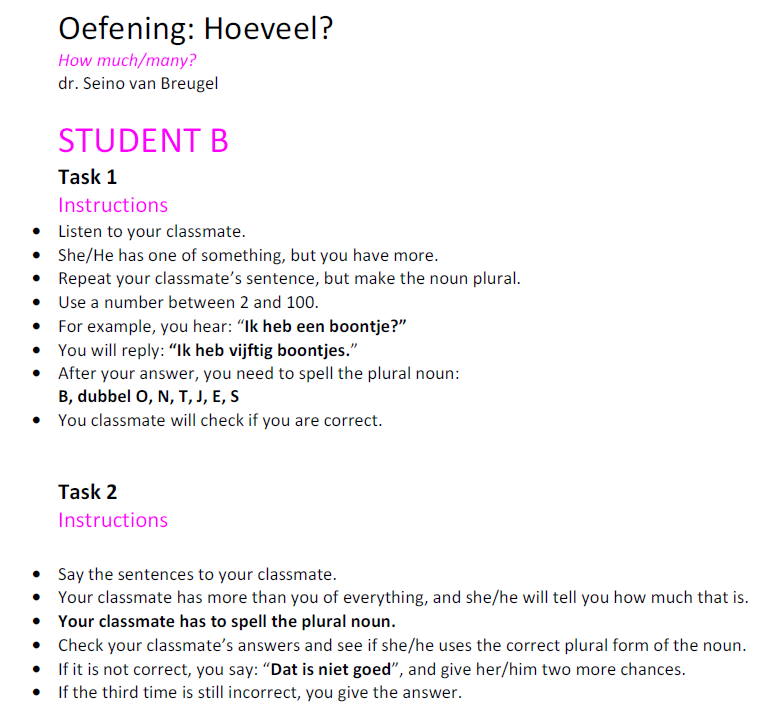 - Een werkblad (2 pagina’s) voor studenten om het meervoud in tweetallen te oefenen. Het is een luister- en spreekoefening. De instructies op het werkblad zijn in het Engels.