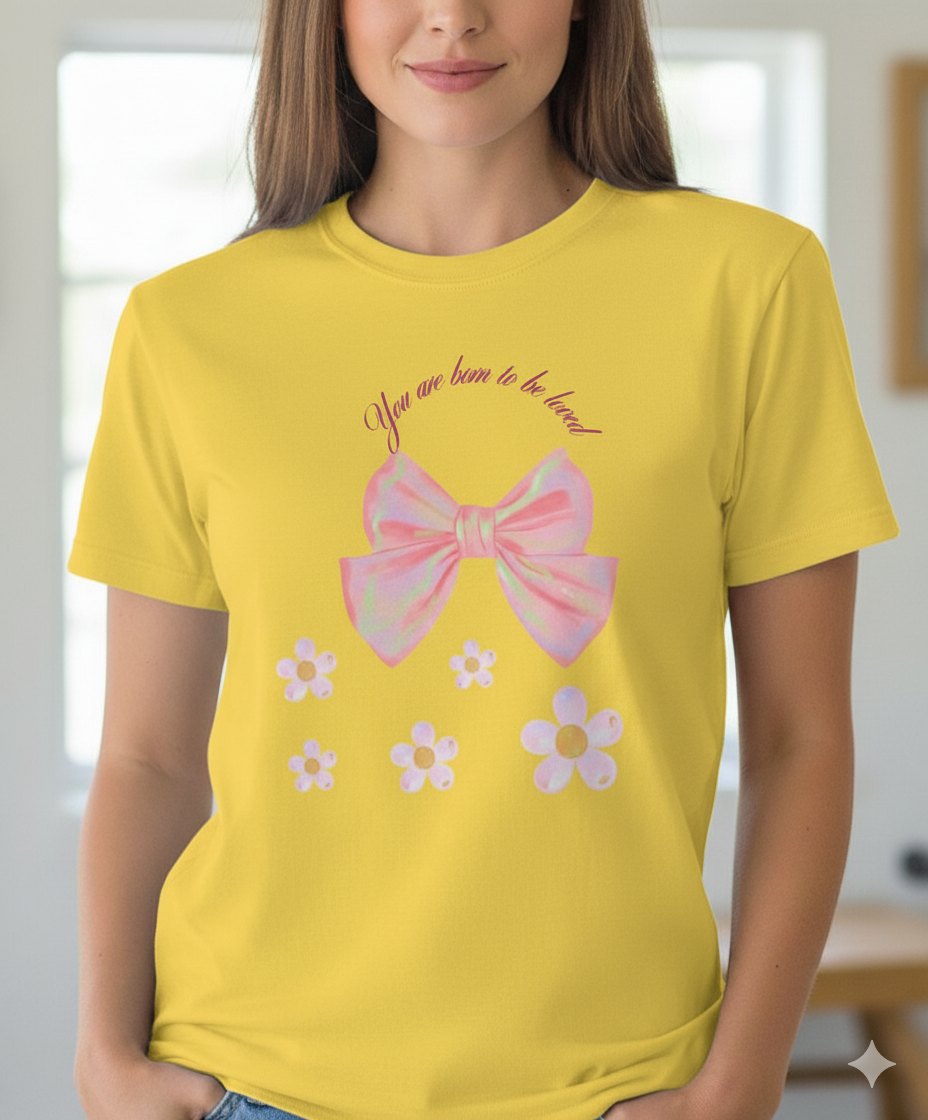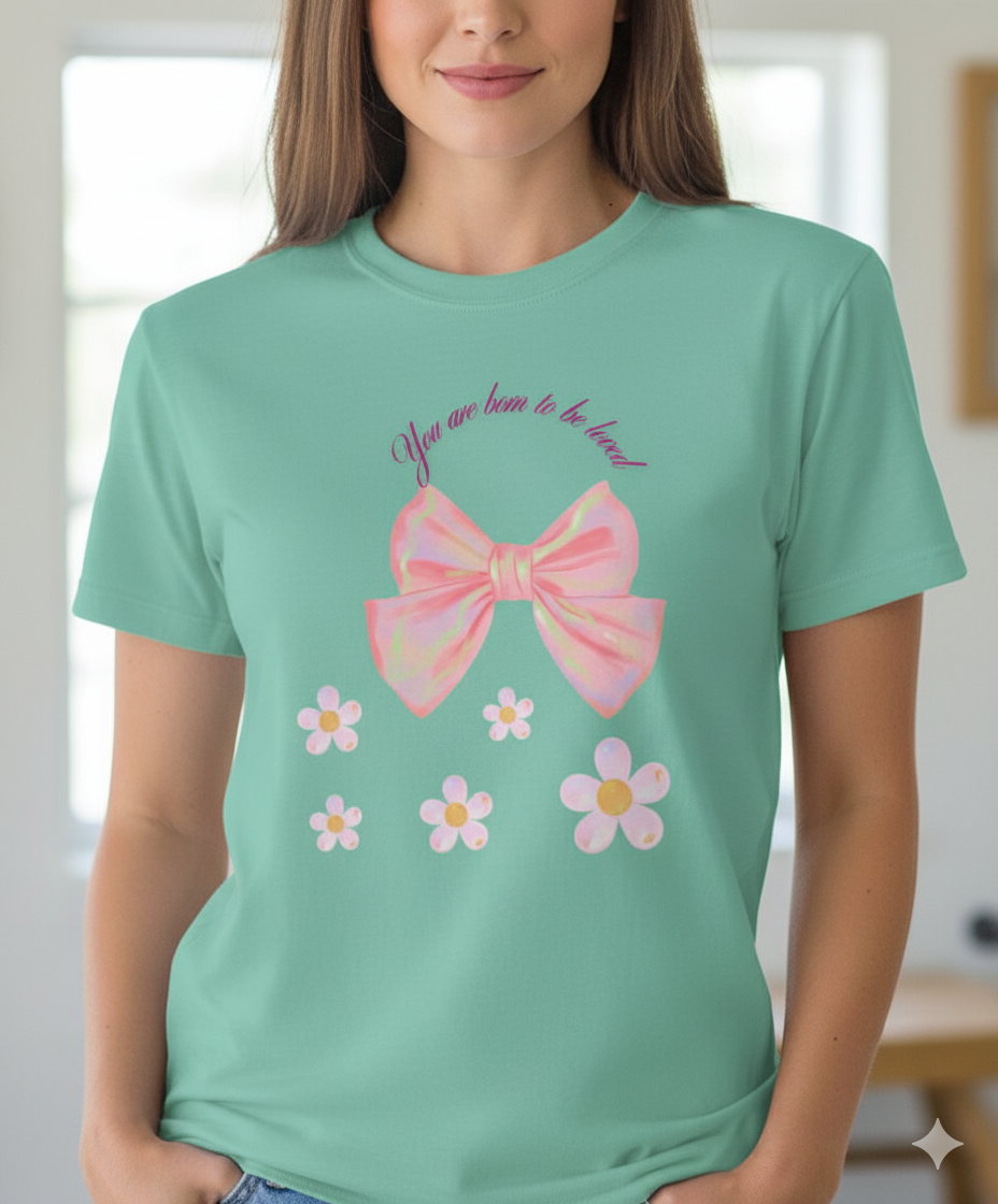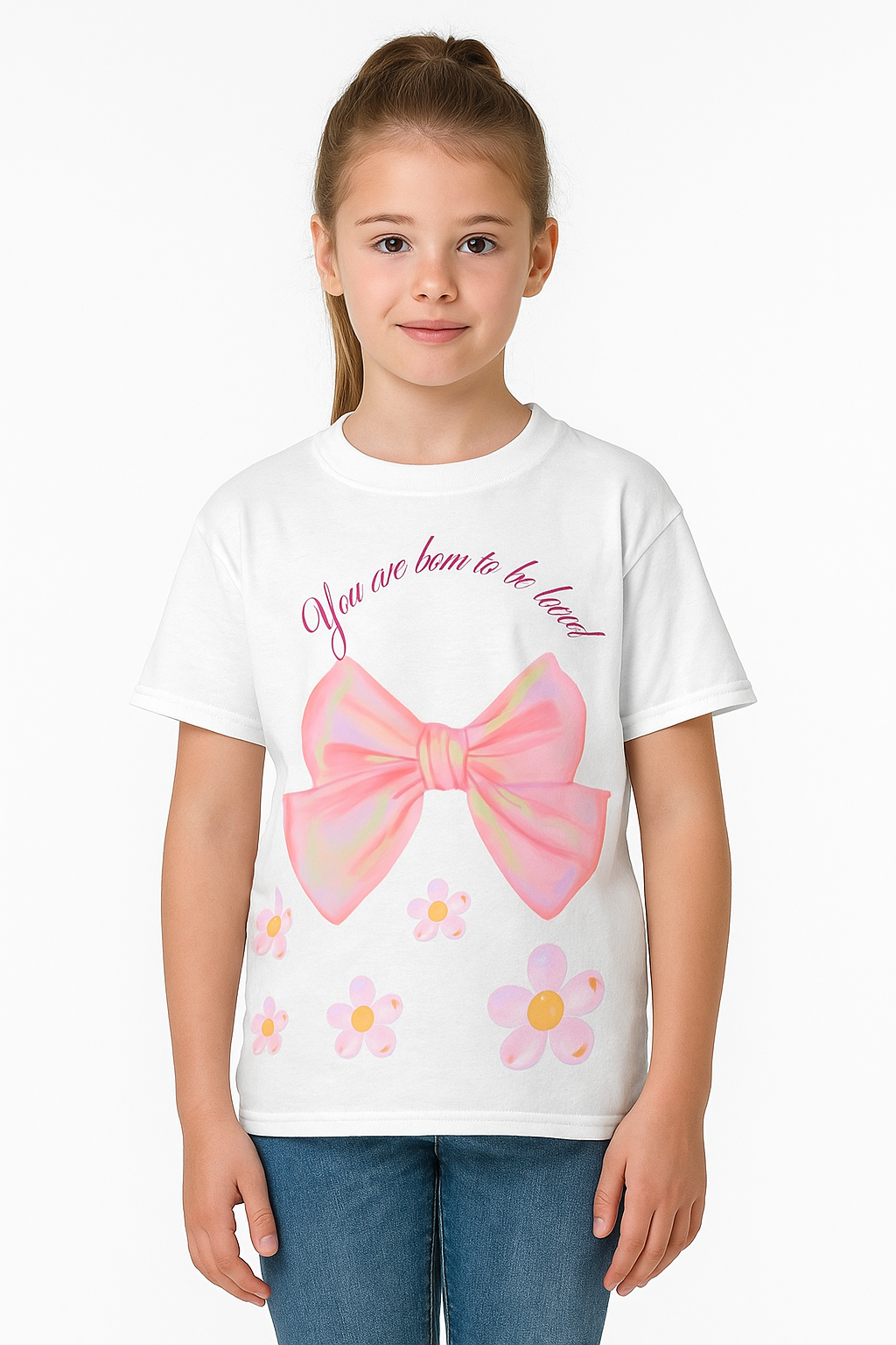 Showcase your designs beautifully with this Girls’ T-Shirt Digital Mockup featuring a pastel bow, floral details, and the quote “You are born to be loved.” 🌼💖