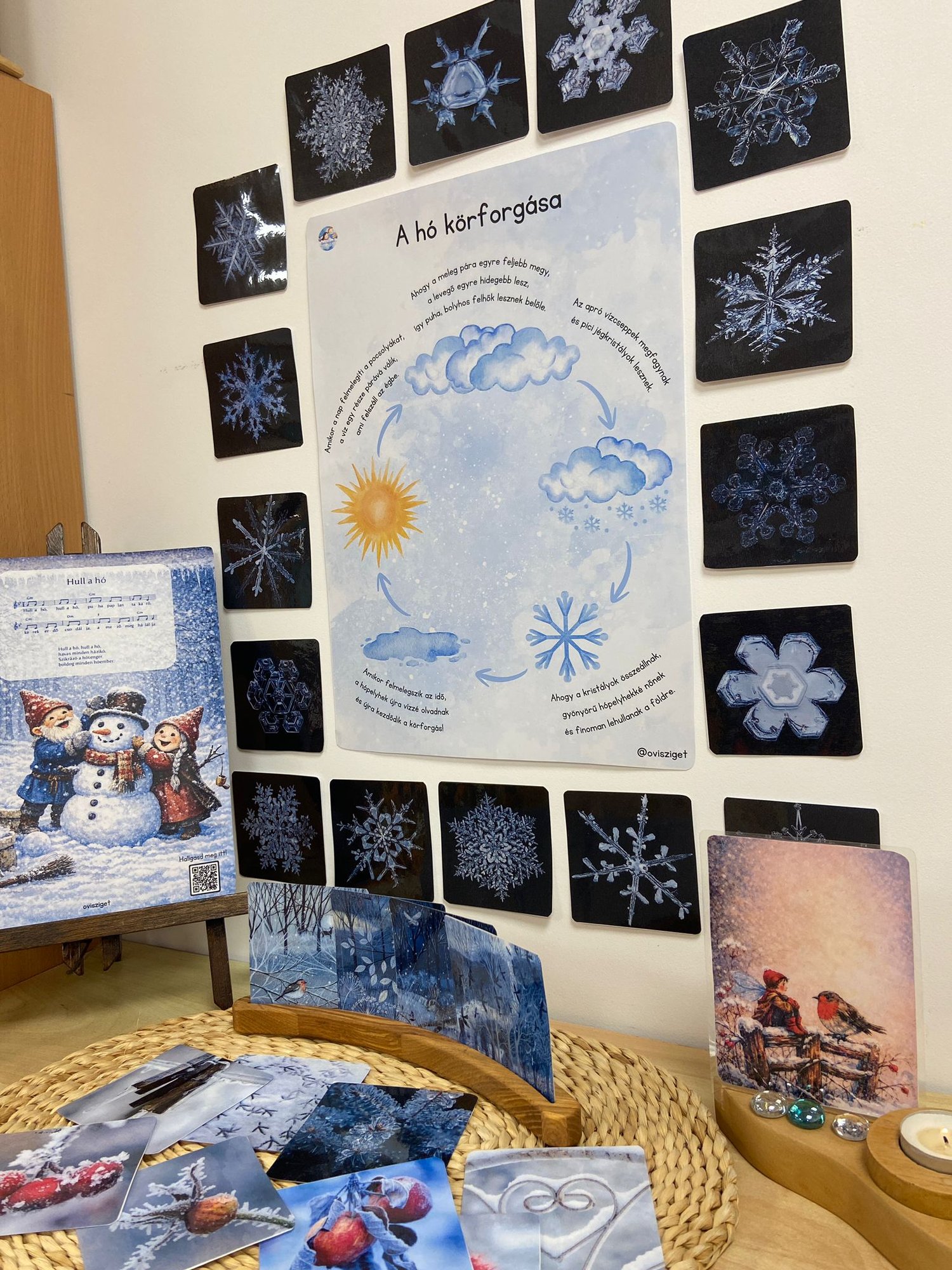 ❄️egy plakátot a hó körforgásáról, egy kedvenc téli dalomat a hó hullásáról, QR-kóddal, hogy a gyerekekkel együtt meg is lehessen hallgatni,
