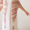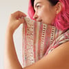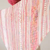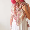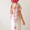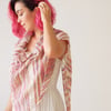 The combination of vertical stripes and playful lace panels creates a modern piece that is simple to style and a treat to knit. Only 2 skeins of fingering weight yarn, knit at a loose gauge, are transformed in an airy and generously sized wrap.