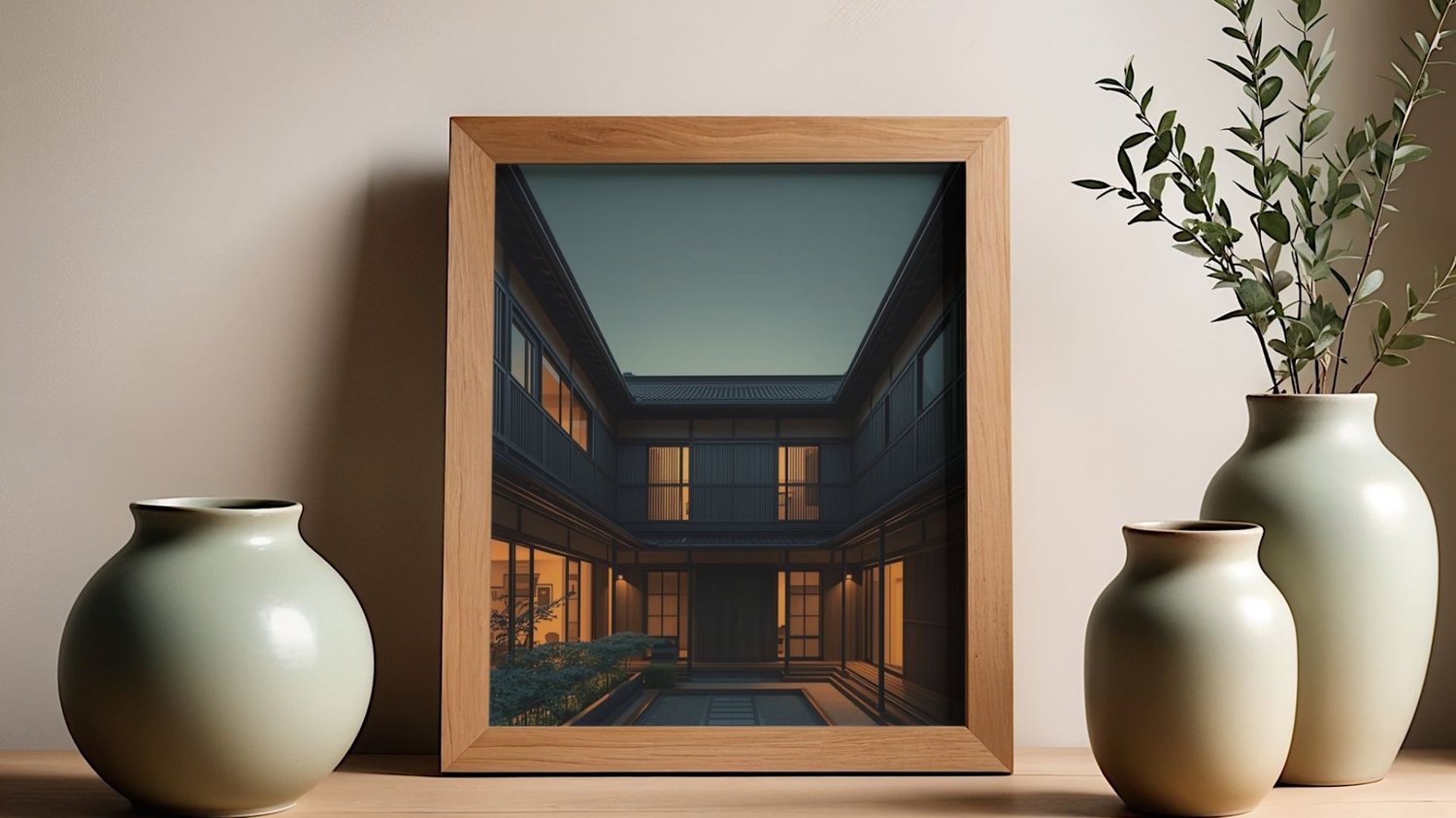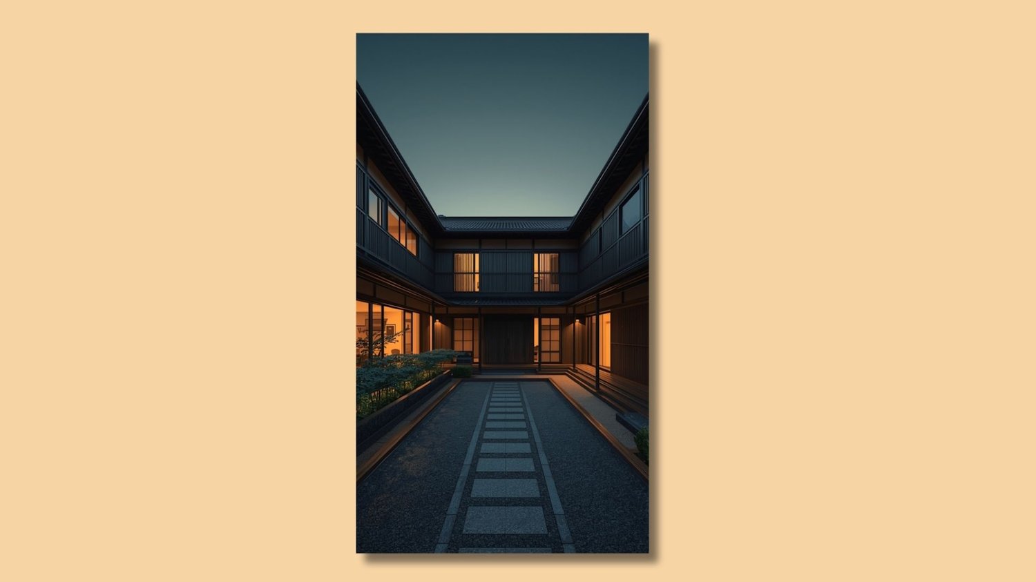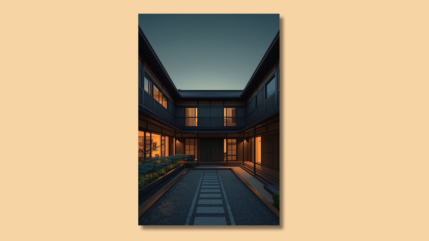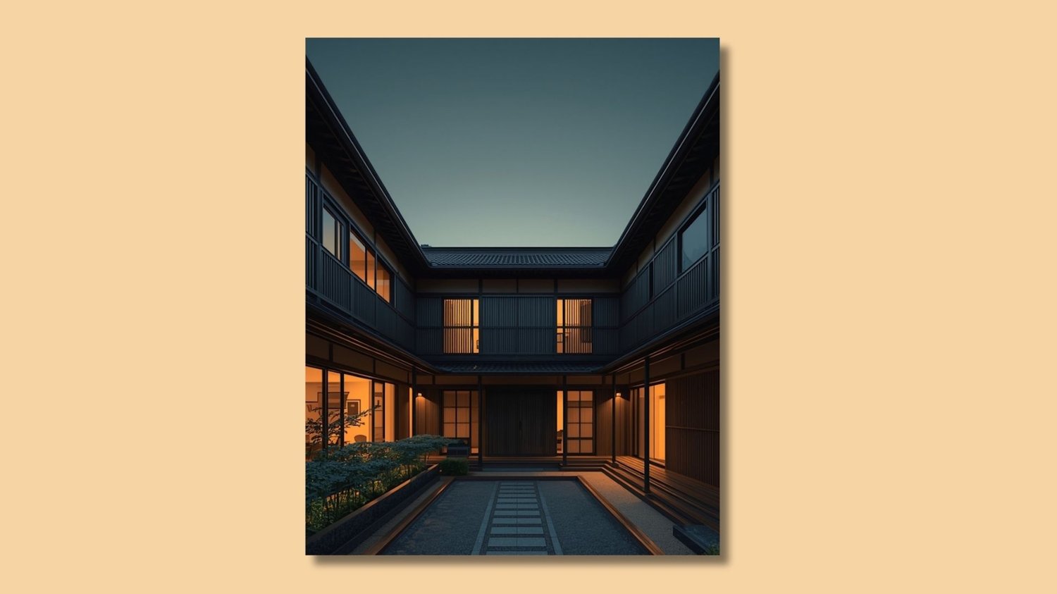 Contemporary Japanese Courtyard at Dusk – Modern Architectural Japandi Wall Art Digital