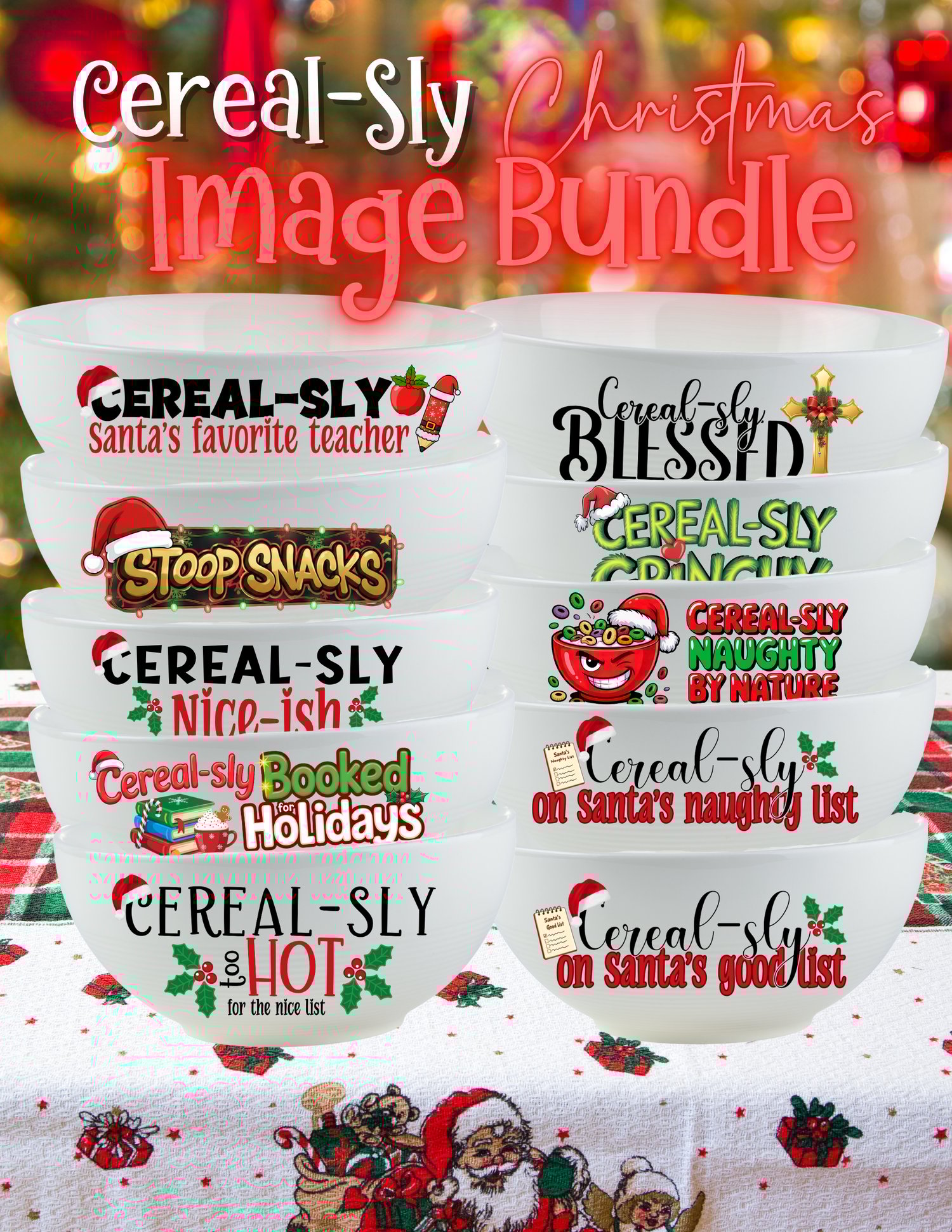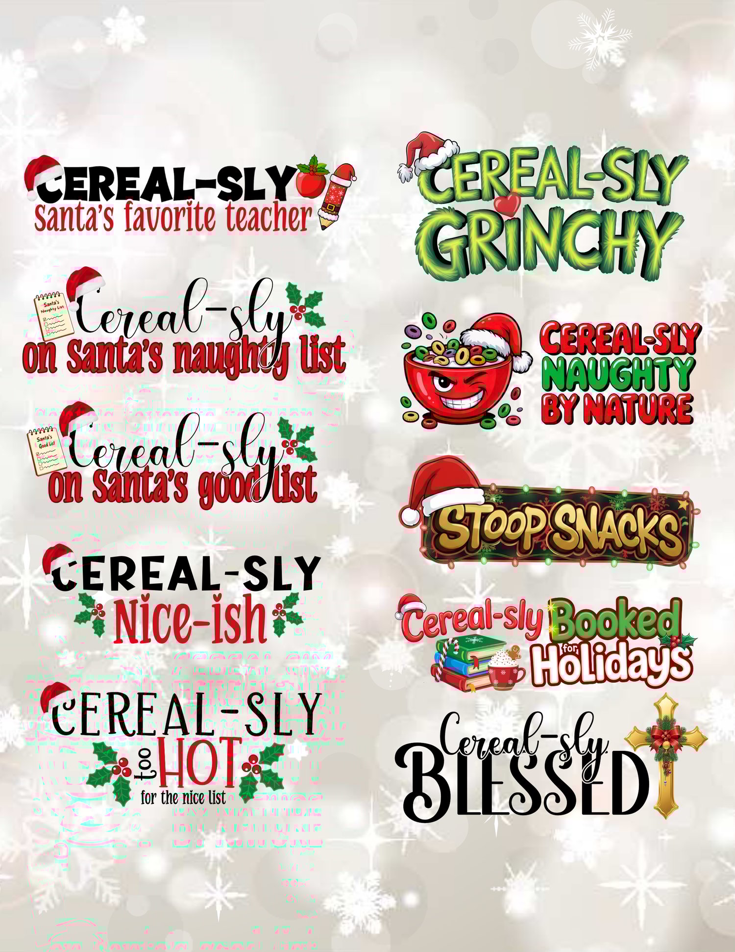 Bring some fun and personality to your holiday crafts with this Cereal-sly Christmas Image Bundle. This collection includes a variety of bold and playful Christmas themed sayings designed to fit perfectly on cereal bowls, mugs, tumblers, bag toppers, stickers, and more. Every design is delivered as a high quality PNG with a transparent background so you can drop it right into your project with ease.