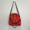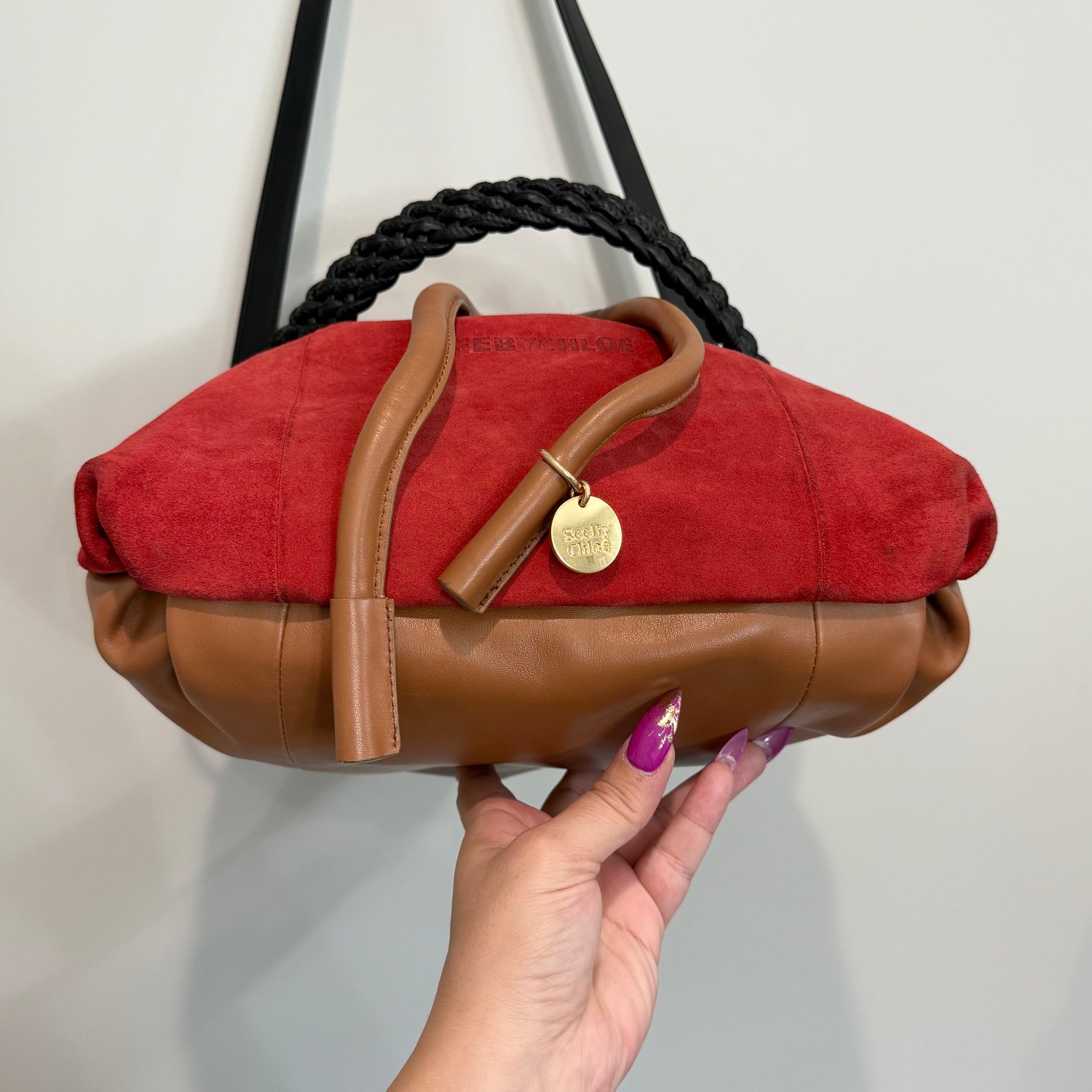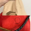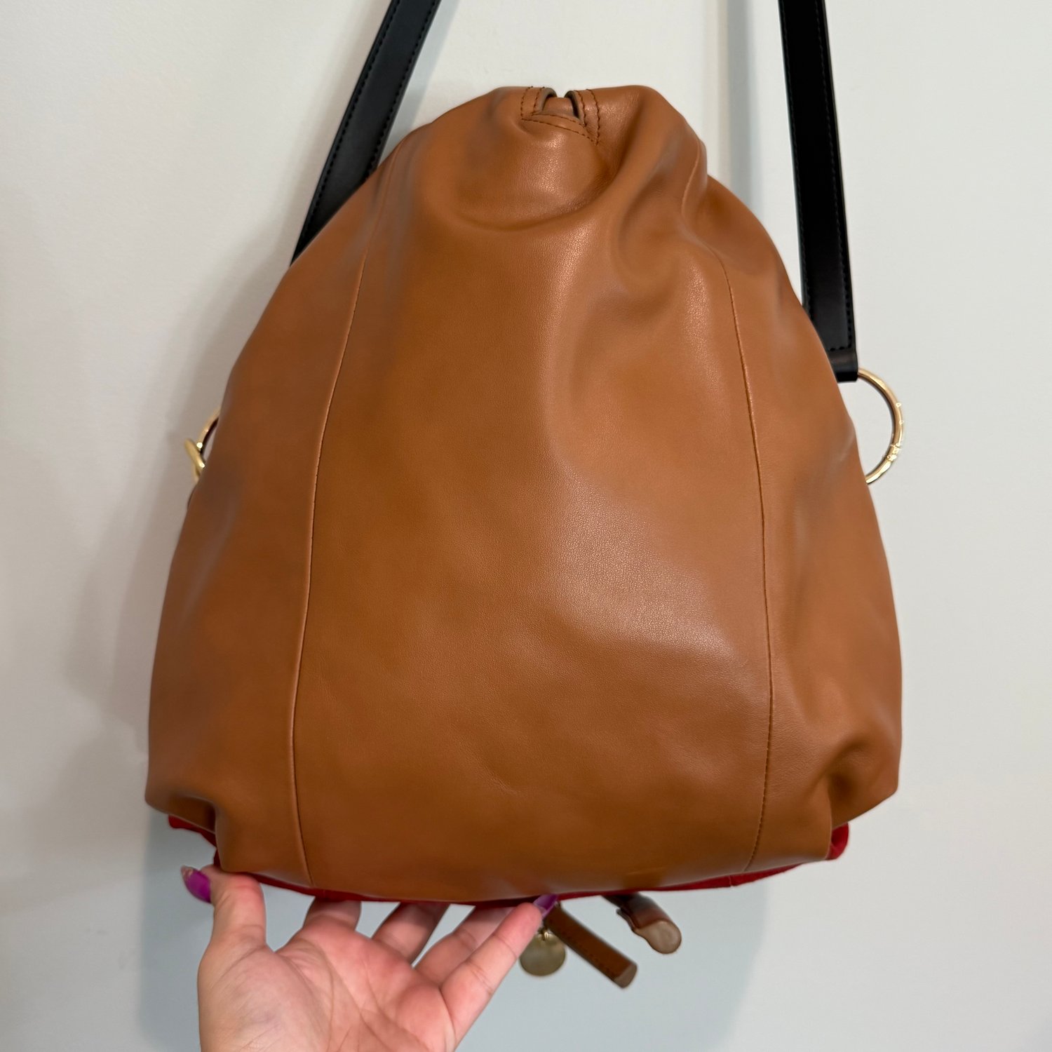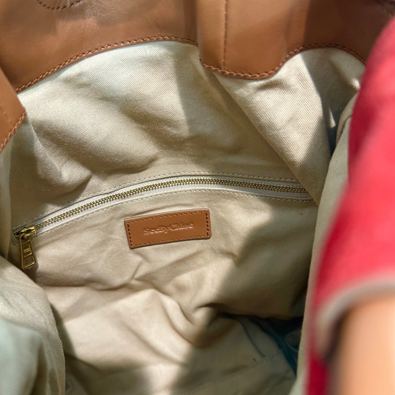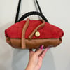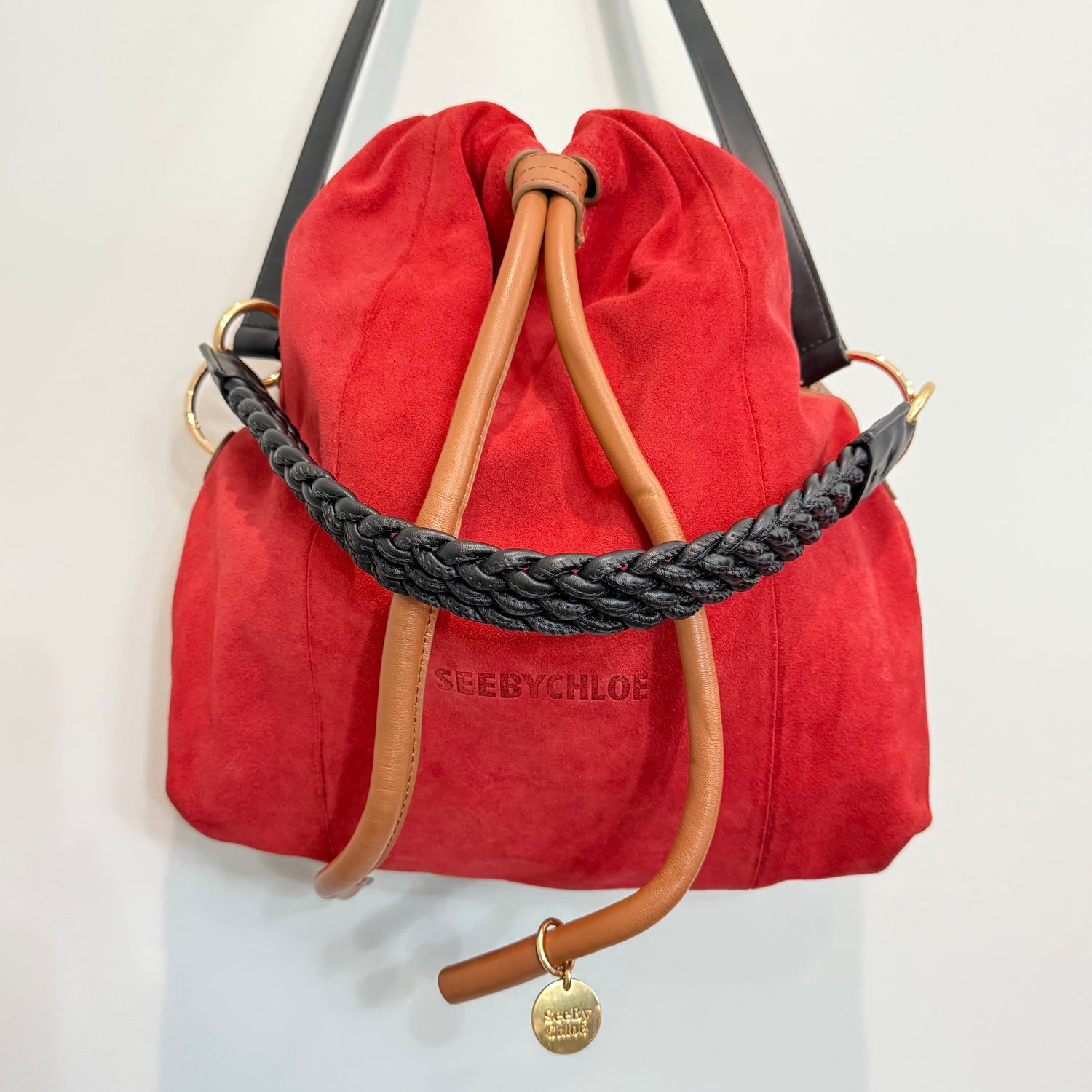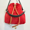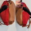 See by Chloe bucket bag which is the diffusion line of the luxury brand Chloe, has red suede, light brown leather and black leather shoulder straps with gold tone hardware. It has a drawstring closure to one compartment which has the branding and a zipper pocket on one side.