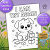 This printable coloring page features a determined puppy stacking blocks alongside the empowering affirmation: “I Can Try Again.”