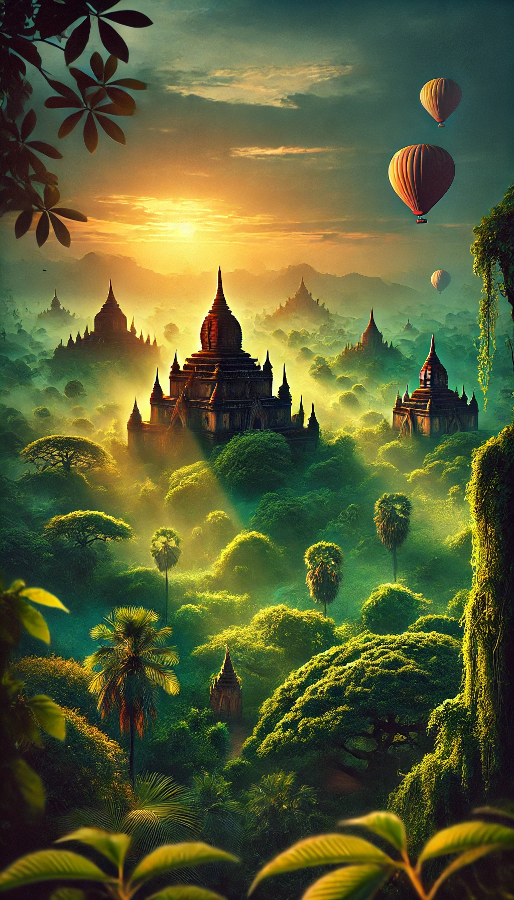 In this vivid reimagining of Bagan, ancient temples rise not just from dust — but from the heart of a wild, living jungle. Thick vines coil around stone, tropical foliage floods the plain, and morning light filters through the canopy, wrapping the sacred ruins in emerald glow and golden mist.