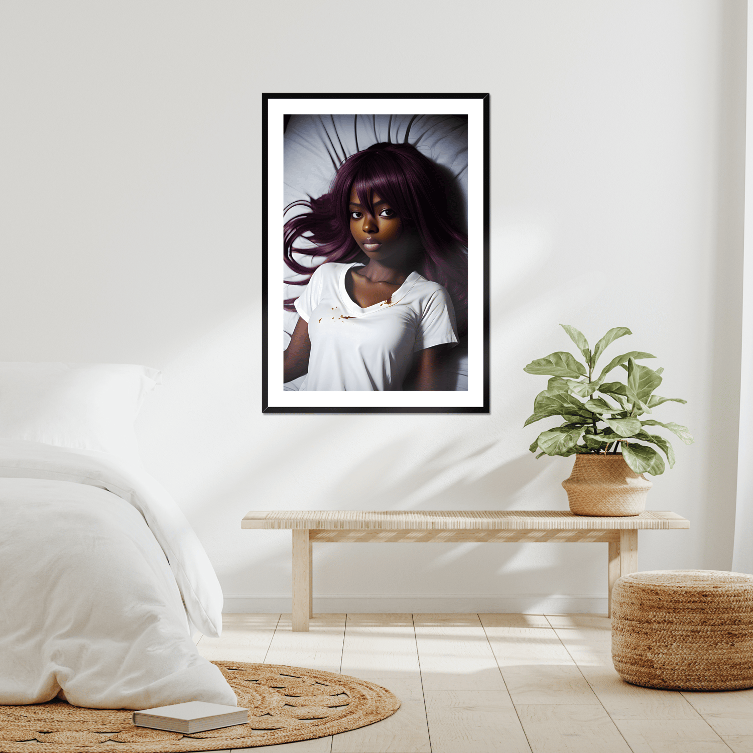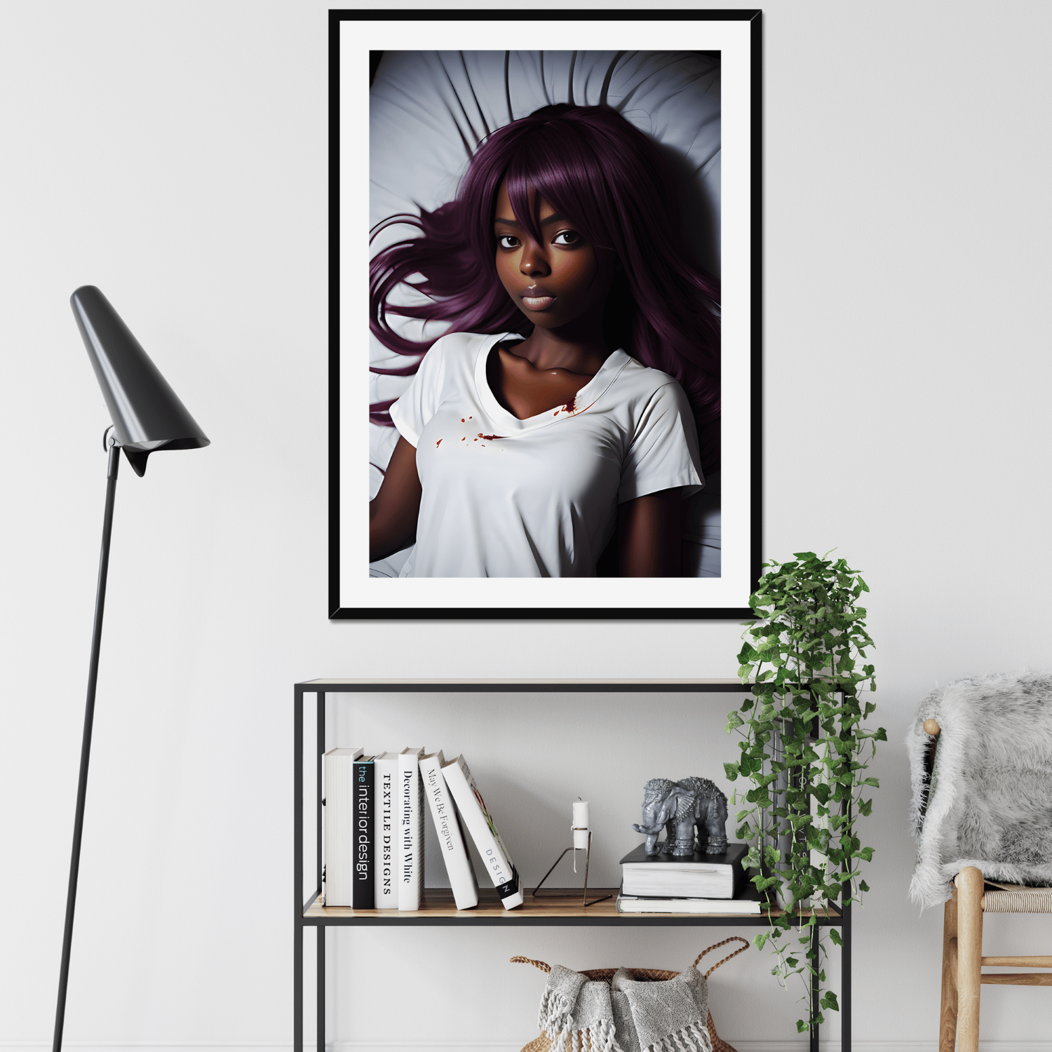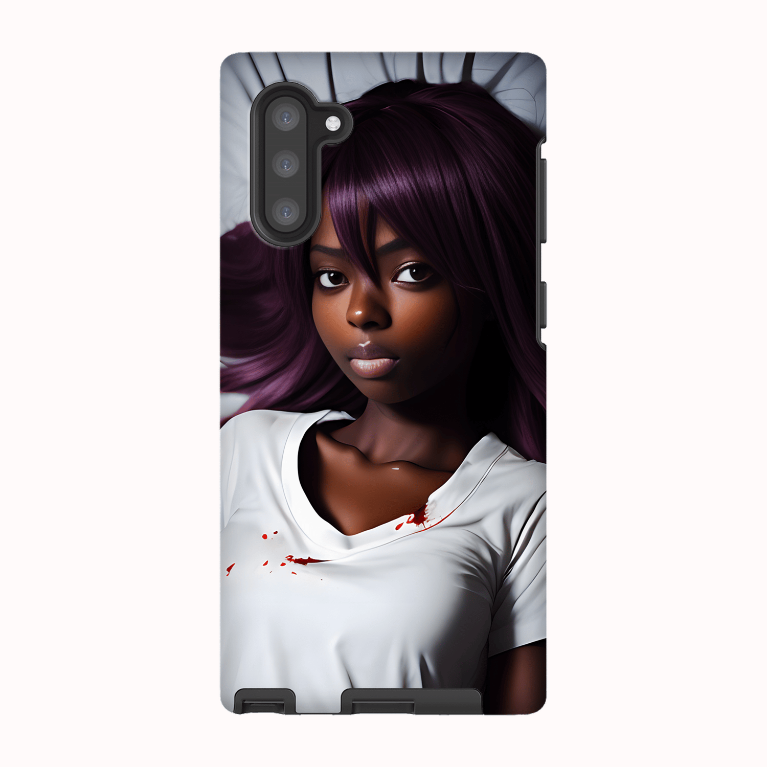 This digital art print captures the essence of a dark-skinned anime girl in a unique and captivating way. The girl is depicted peacefully lying down in bed, adding a sense of tranquility to the overall composition. The subtle inclusion of specks of blood on her white t-shirt adds an intriguing element, evoking curiosity and inviting viewers to interpret their own narrative behind the artwork.