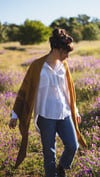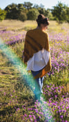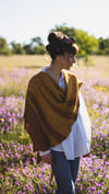 É um xaile assimétrico, tricotado de uma ponta a outra, com secções de voltas encurtadas numa cor contrastante.