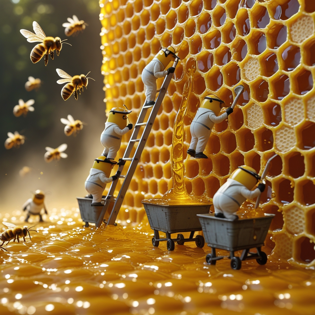 A whimsical scene of miniature minion workers extracting honey from a giant honeycomb