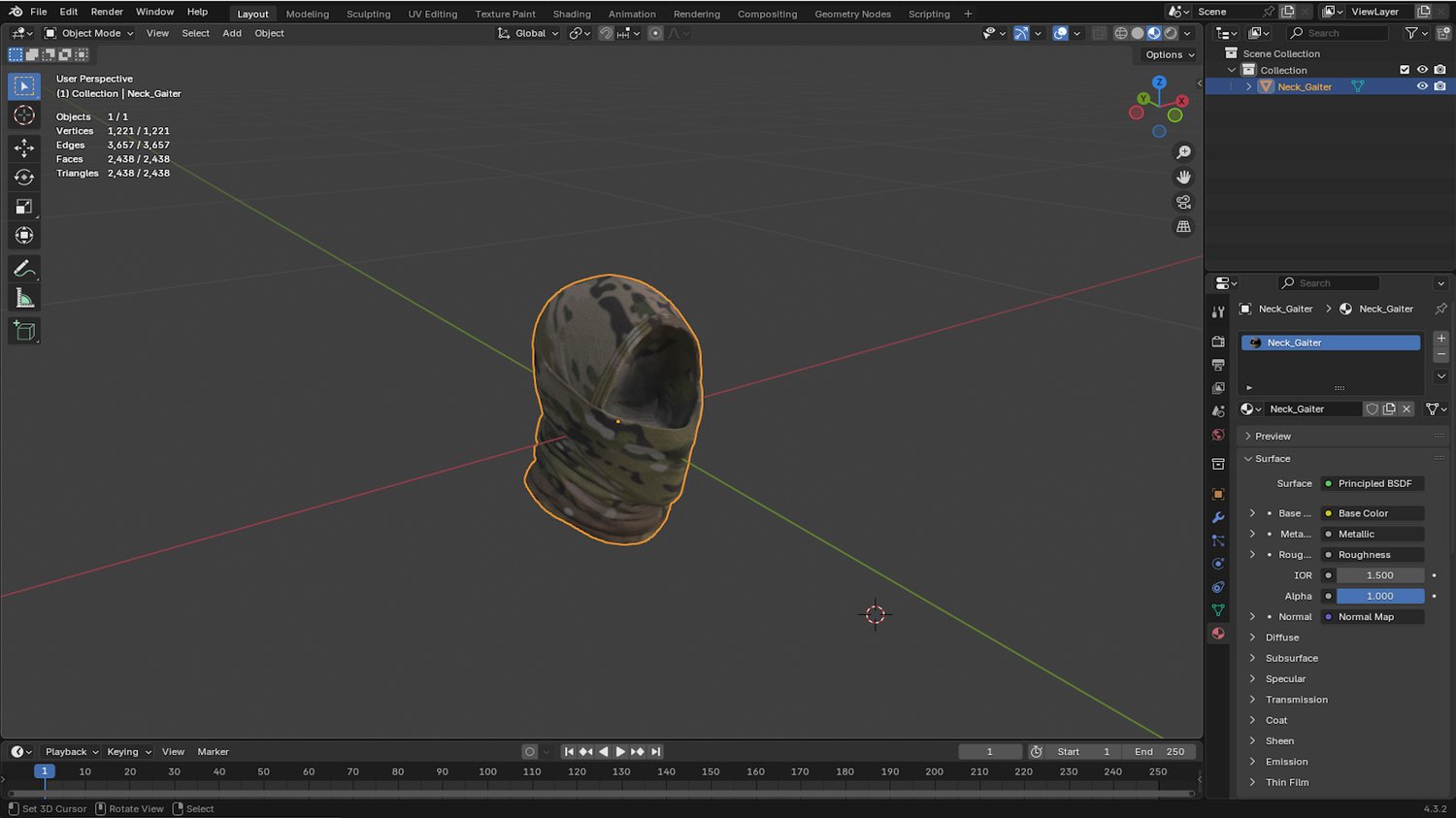 Game-ready 3D model of Neck Gaiter. Great for games such as Arma 3, DayZ, Reforger, Ready or Not, etc. This model was made with care and with easy rigging in mind demonstrated by the grid-like topology.