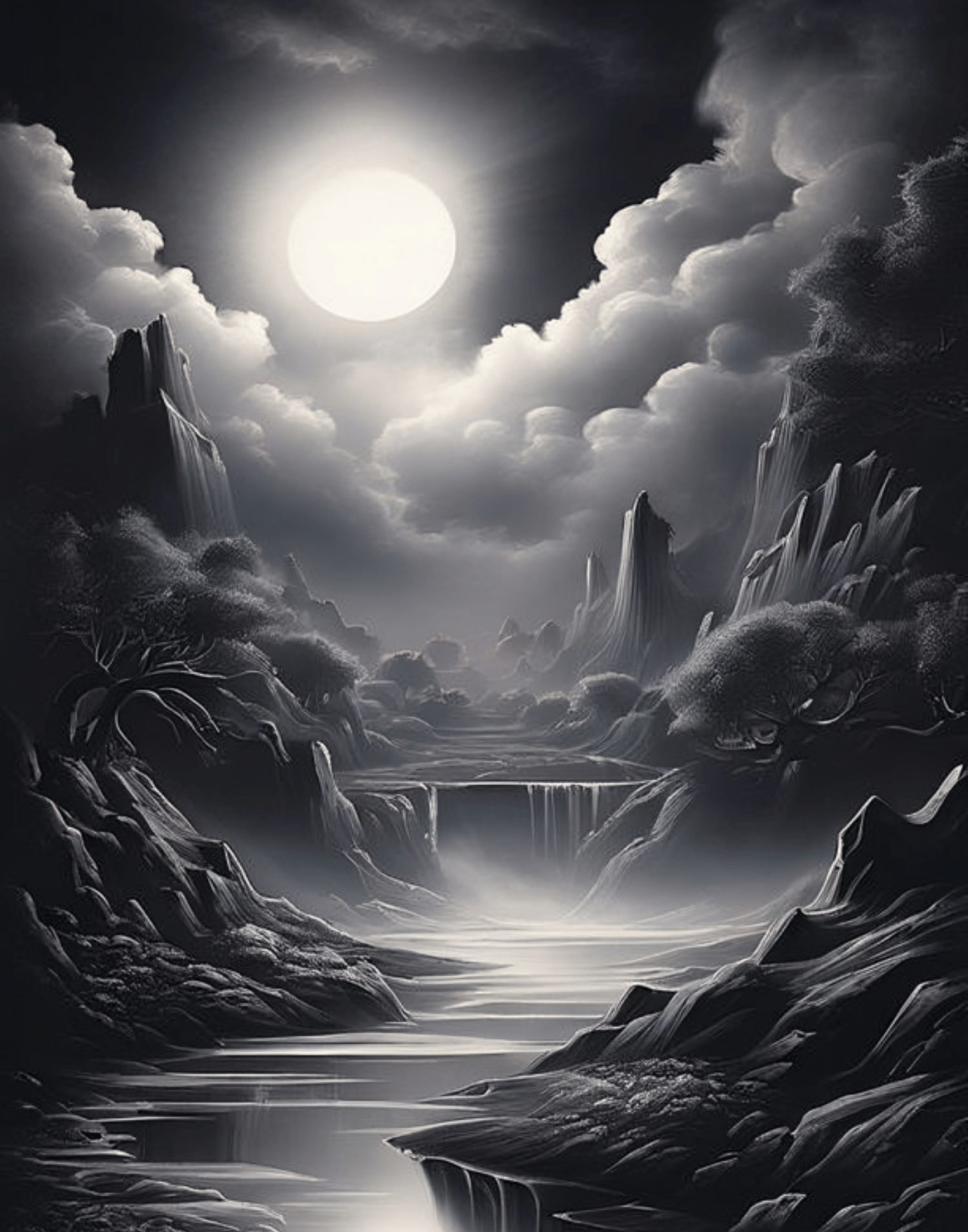 Moonlight River Waterfall, Mountain Landscape, nocturnal Beauty, Vintage Nightlife Nature, Natural Wall Art, Vintage Landscape, Nostalgic Nature, Cool Nature, Rustic natural Landscape, Painting.