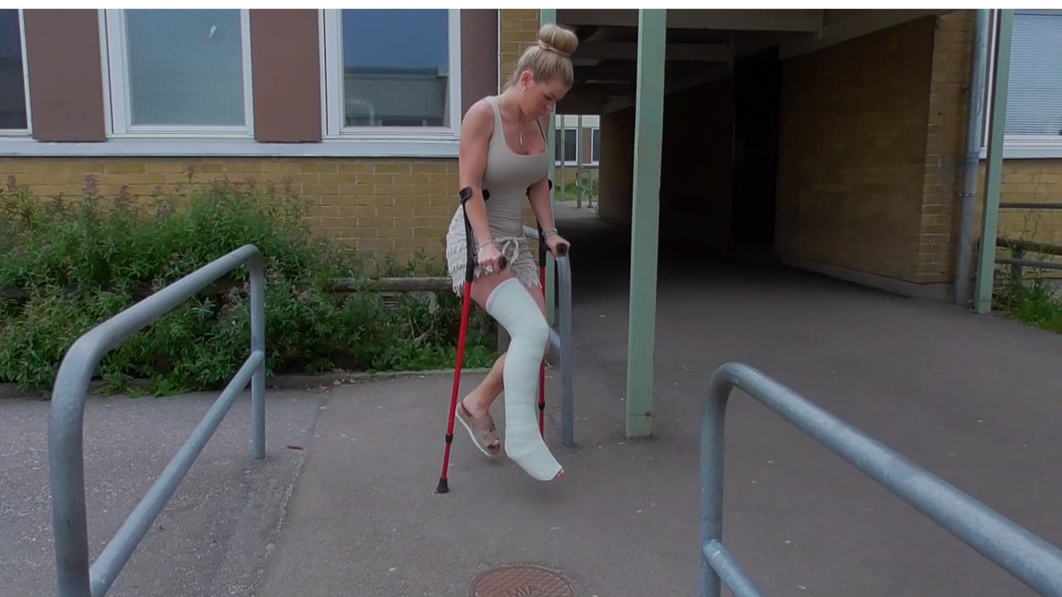 Ice bored out of just sitting all day long waiting for time to pass by so Ice picked her crutches up and went for a quick walk while her leg is broken and casted in a huge white LLC. Right now Ice is seen crutching gently around the school that she attended to when she was a little kid. Ice looks her ways around as he feels very nostalgic being here, she stops once in a while to check her hands as they hurt a little because of all the crutching. Very good views of her casted leg is seen all the time during the entire clip, exclusive closeups are filmed very closely during the time she sits down for her breaks as well. As she gently rubs her hands on the casted leg and shows up her white classy pedicure. After a long rest Ice had to crutch back home again to prepare for the coffee meet, she says that it’s very exhausting for her to hold the cast up all the time because she’s not wearing heels today. Ice takes one last break as closeup of her casted foot is recorded before the clip ends as well.