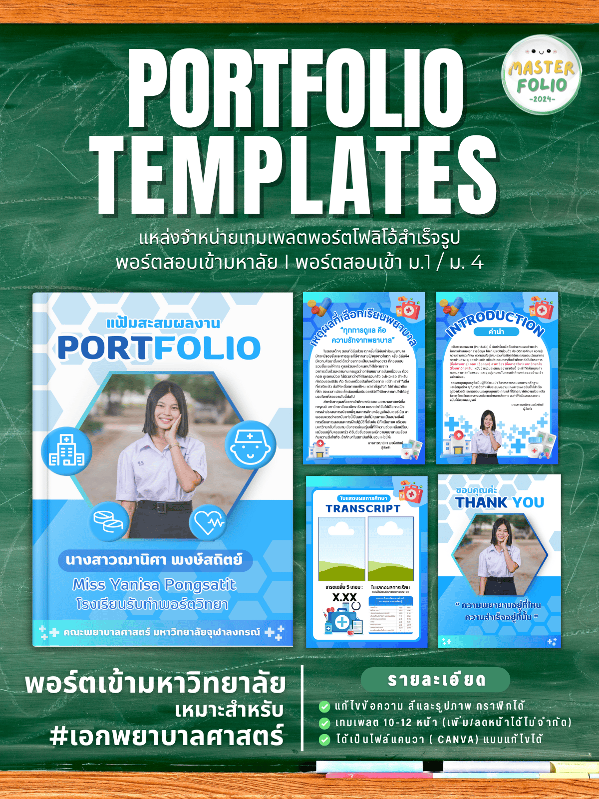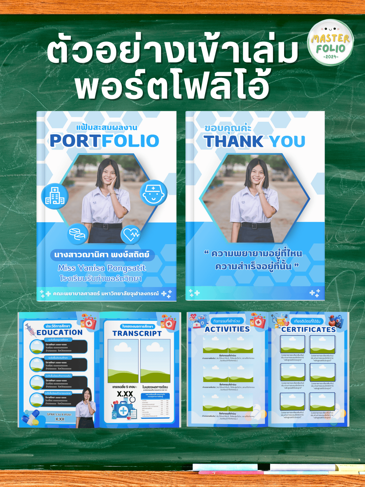 • มีโครงสร้างครบ: Preface/SOP/Contents/Profile/Education/Transcript/Activities/Certificates/Thank You