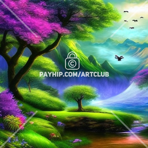 This image is a beautiful landscape painting of nature, featuring lush green trees and a winding river. The sky is painted in shades of blue and purple, with white clouds scattered throughout. In the foreground, there are several vibrant purple flowers that stand out against the green foliage. The trees have long branches that reach up towards the sky, creating an interesting contrast between their dark trunks and bright leaves. Further back in the background, more trees can be seen along with some hills or mountains in the distance. This painting captures a peaceful moment of nature's beauty and serenity - perfect for anyone looking to relax or find inspiration!