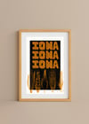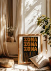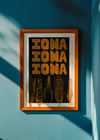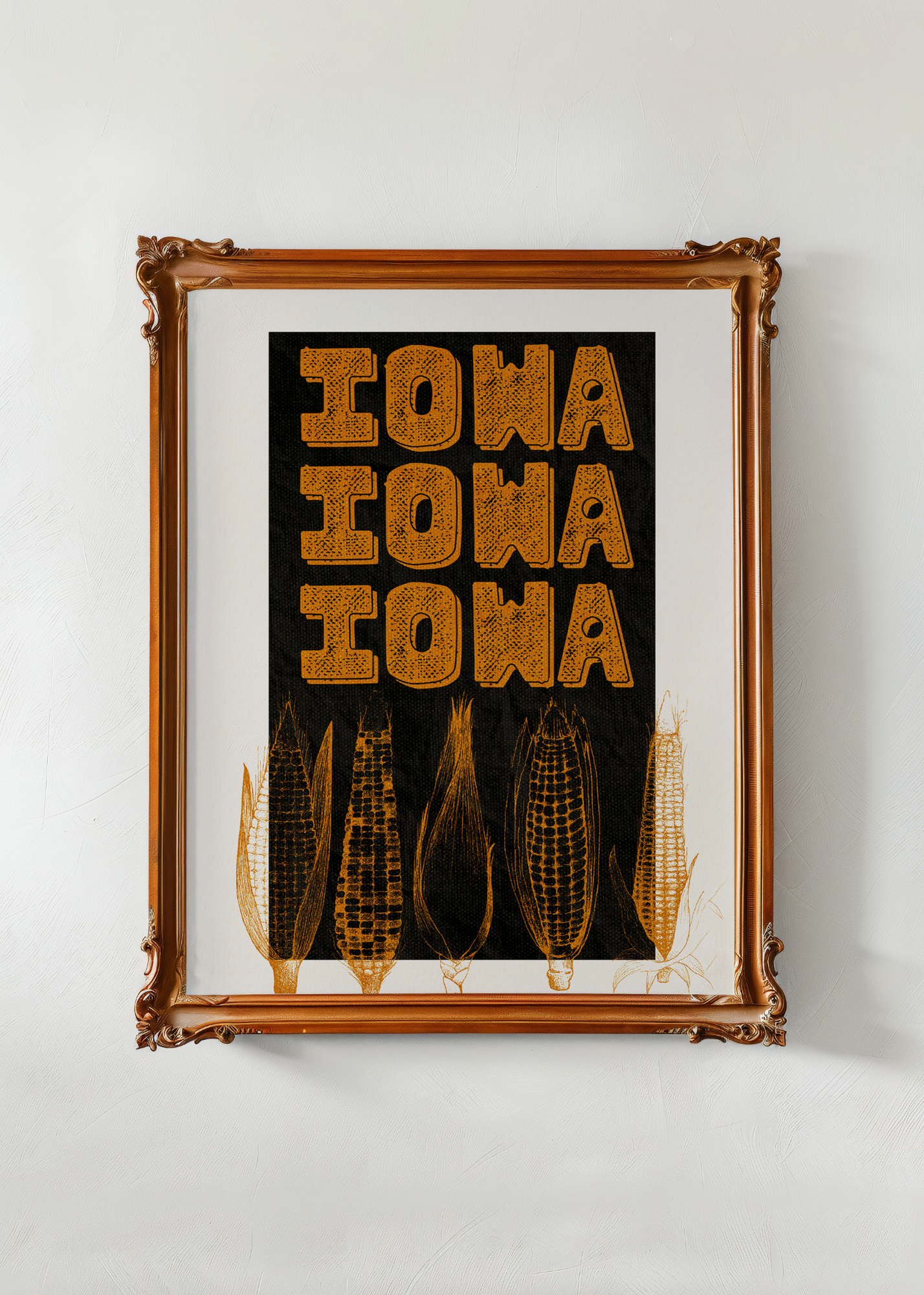 Iowa Iowa— This print is a charming shout-out to the heartland. Set in a white frame, and a deep black background, it features bold stacked lettering: “Iowa Iowa Iowa.” At the bottom, a sweet cluster of illustrated ears of corn adds a little farm-fresh flair. Nostalgic, whimsical, and perfect for Midwest lovers and corn enthusiasts alike.