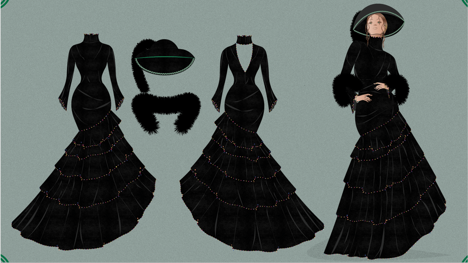 Introducing second piece "Black Mermaid Layered Gown Fashion Illustration" to a collection of beautiful and exquisite gowns. The fashion illustration presents a design of black mermaid layered gown with frilly colorful beaded neckline and long frilly bell sleeves style. The look is completed with a panama fur hat and fur scarf. The illustration is available in high resolution in PNG and PDF format.