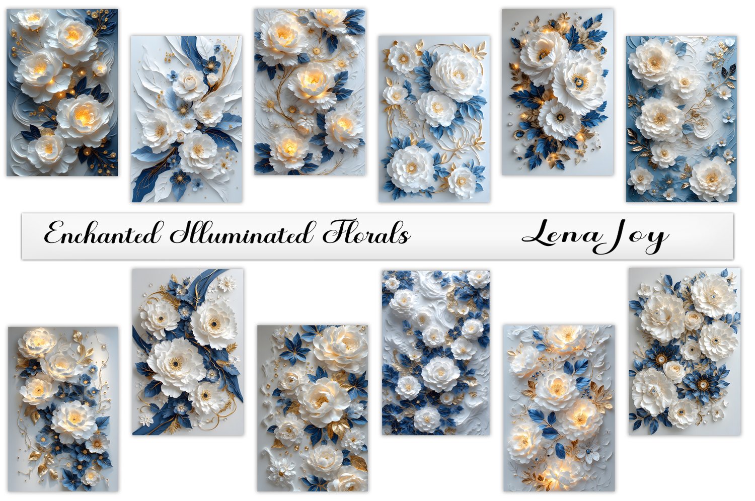 Keywords—flowers, floral, white, deep blue, gold, swirls, golden light, glow, jewels, blue leaves, gold leaves, depth, contrasting, rich, lovely, elegant
