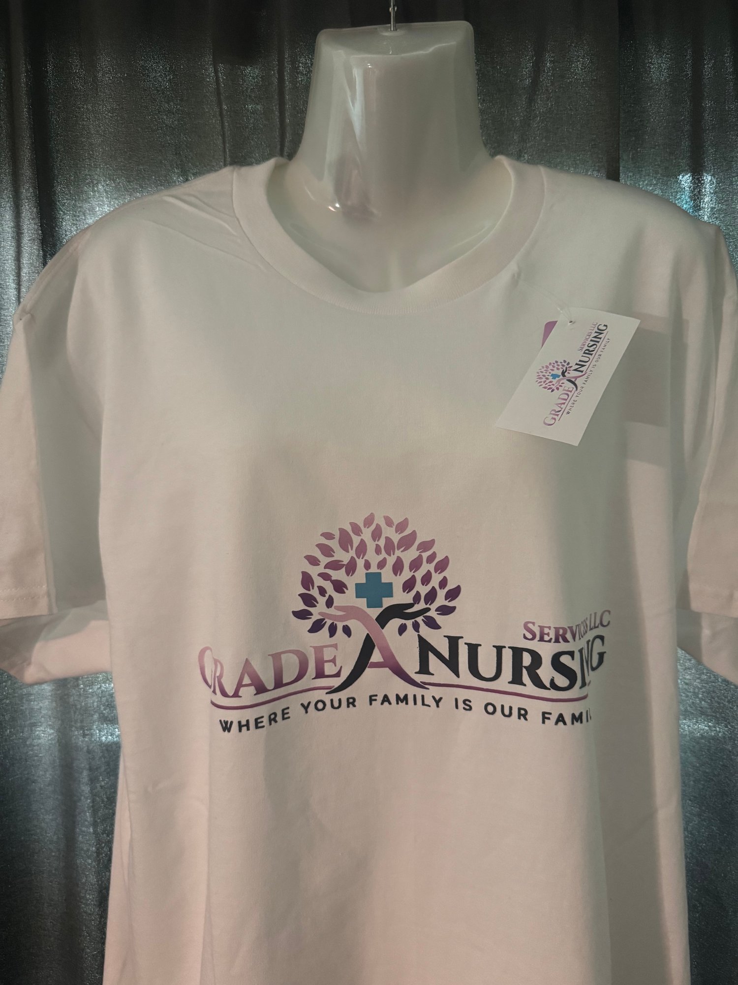 Show your support and pride for Grade A Nursing Inc. with our stylish and comfortable t-shirt! Made from high-quality, breathable fabric, this classic black t-shirt features our company logo prominently displayed, making it perfect for work, casual outings, or showing your dedication to exceptional caregiving.