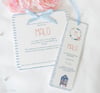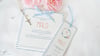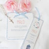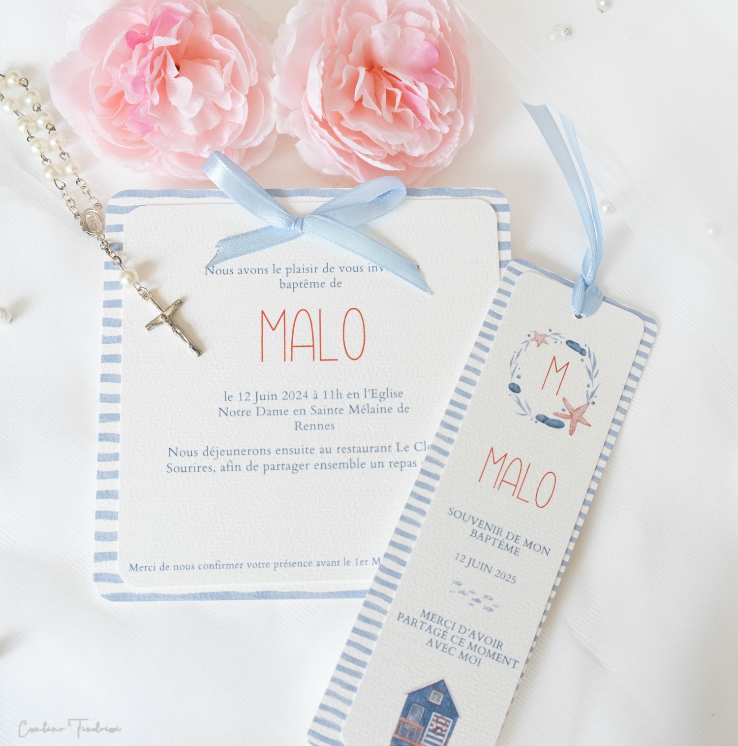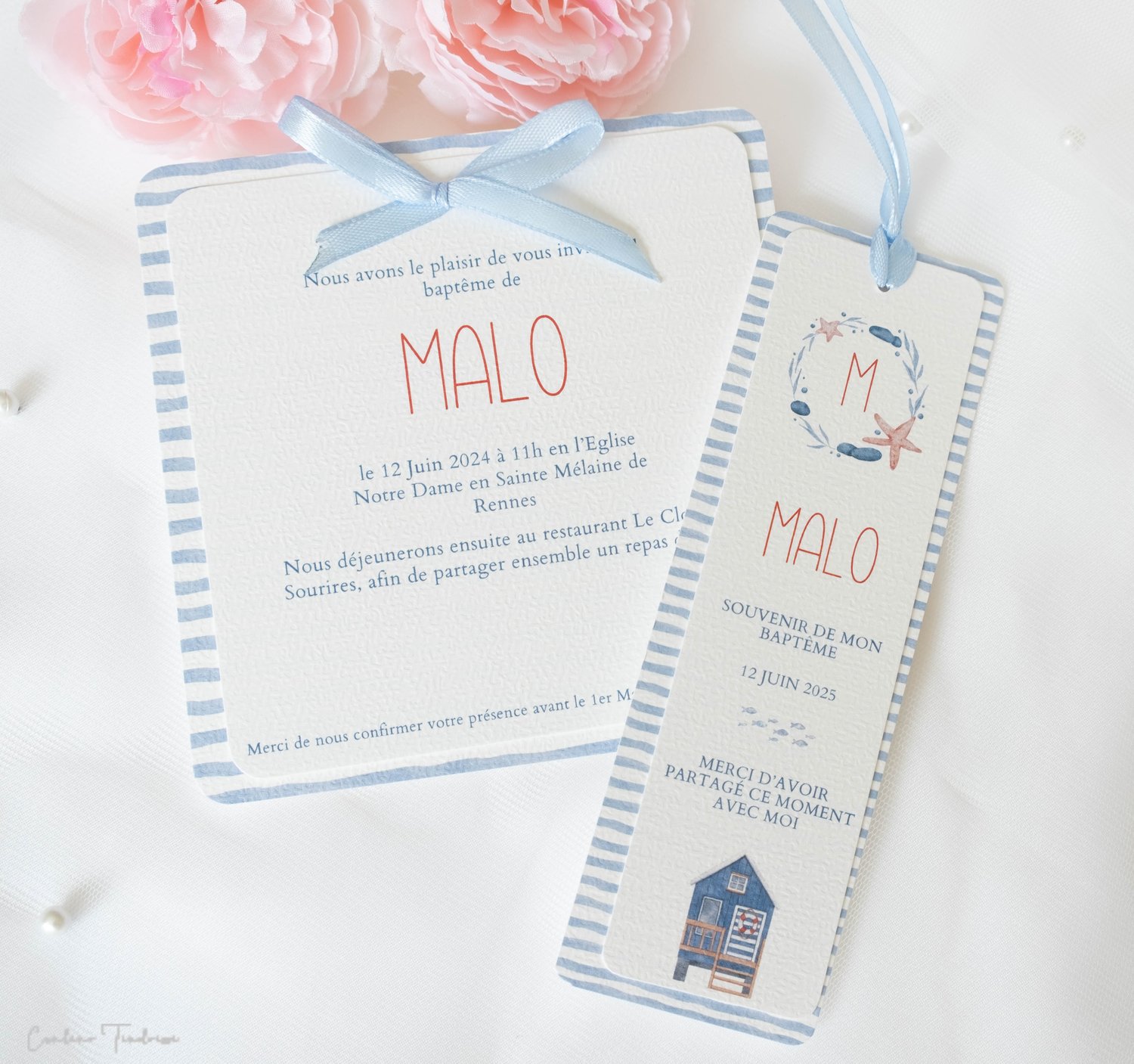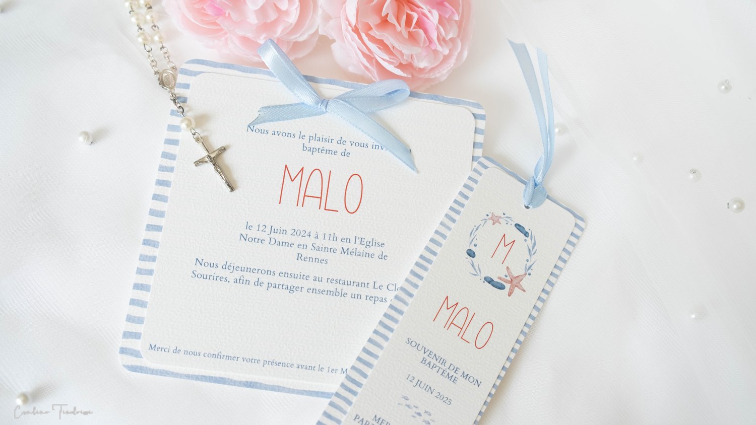 Dans la collection : Signets souvenir, faire-parts et enveloppes coordonnés, marque places, étiquettes pour dragées et menus.