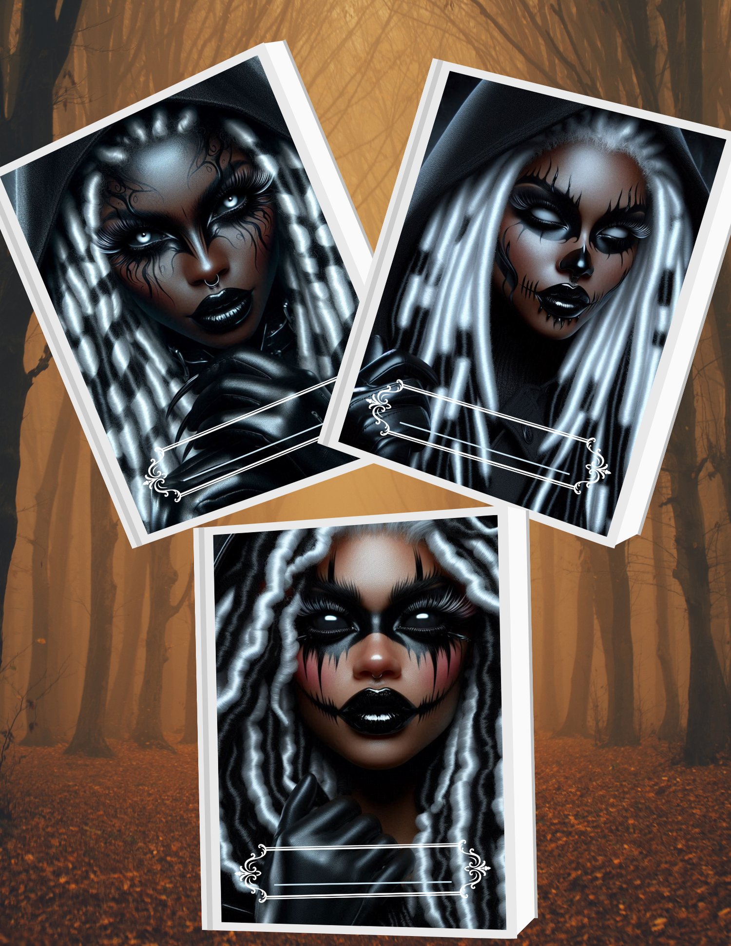 This digital set includes 3 printable notebook covers featuring mysterious gothic women in a dark, eerie style – perfect for planners, journals, or DIY creations.