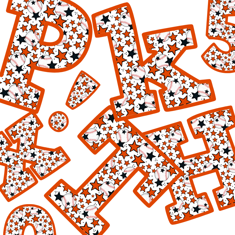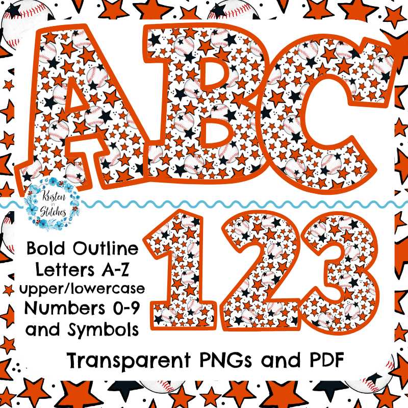 A baseball-themed print and cut alphabet, numbers and symbols clipart set. Featuring stars and baseballs in Baltimore Orioles team colors. This set includes uppercase and lowercase letters A-Z and numbers 0-9 and common symbols. See photo for a visual of the letters and numbers.