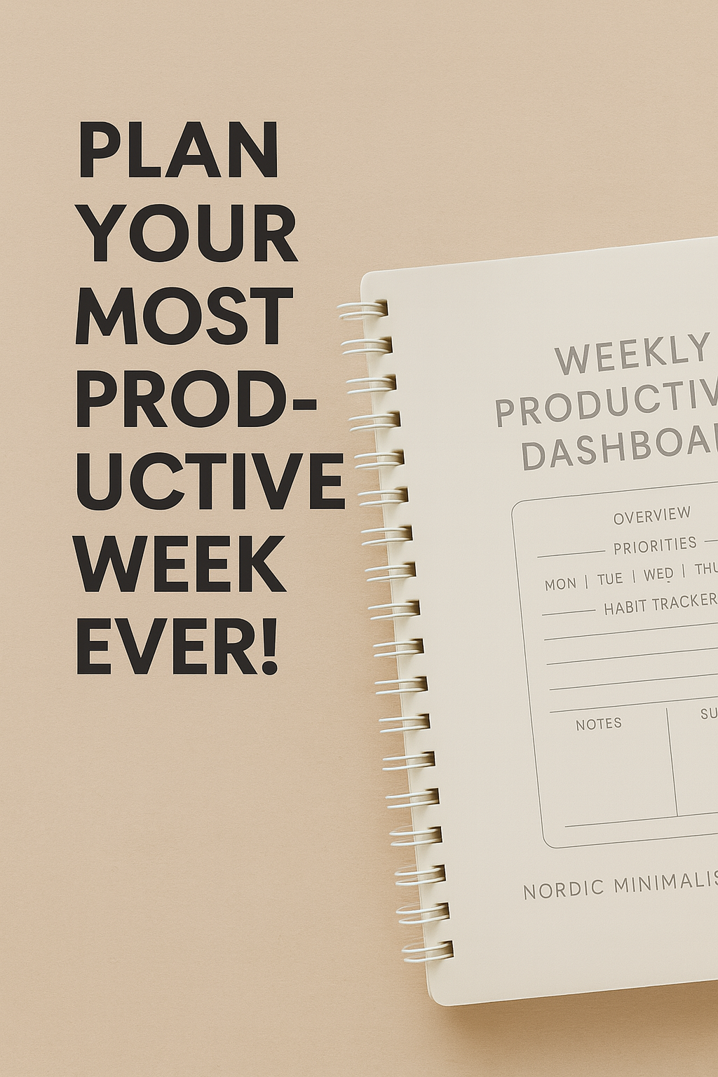 A minimalist weekly productivity dashboard designed to give you a clear overview of your tasks, priorities, and weekly goals. This clean Nordic layout helps you stay organized, focused, and intentional throughout the week.