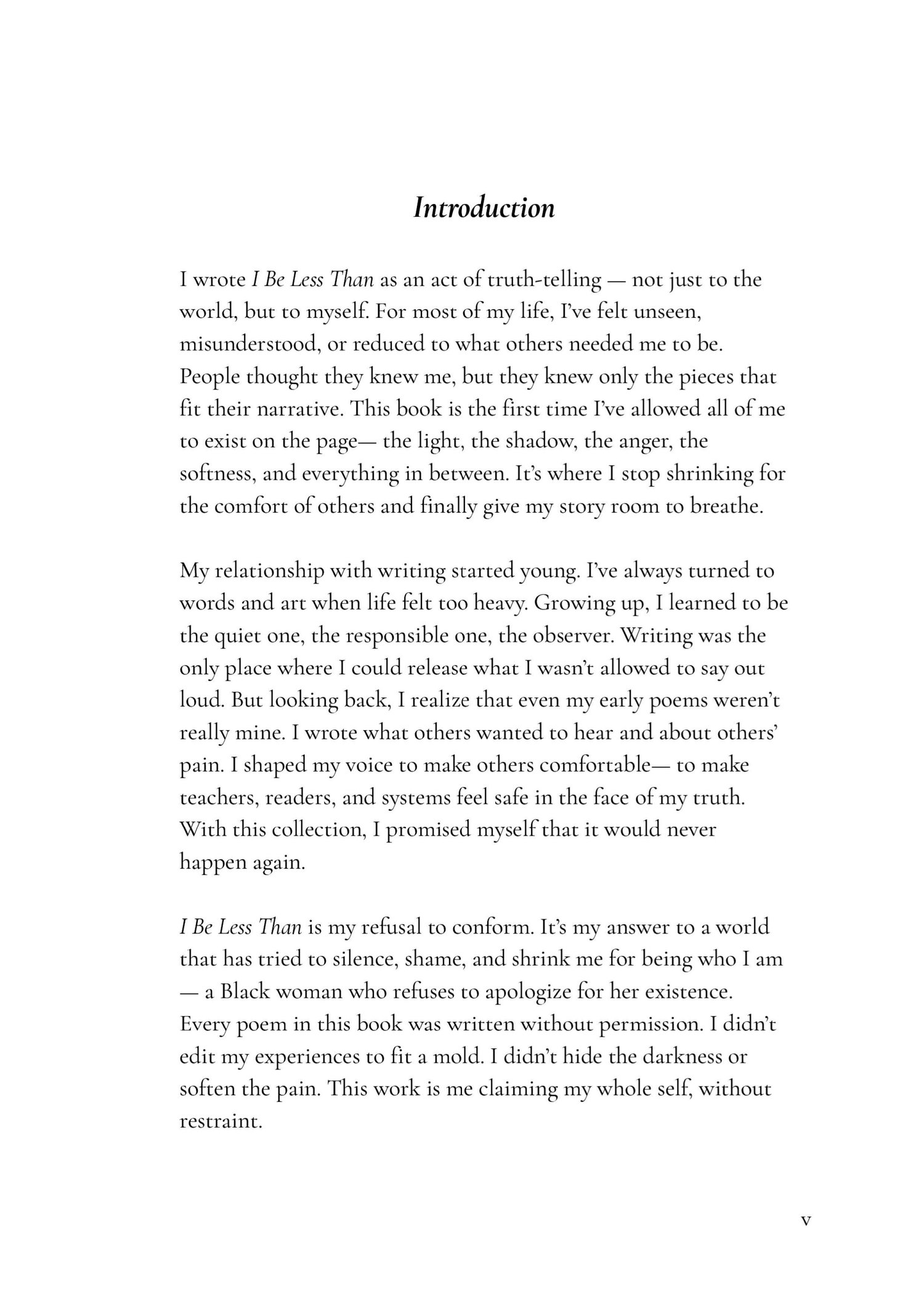 I Be Less Than is a self-help and wellness poetry book designed to support emotional healing, self-reflection, and personal growth. Through honest, rhythmic poems and guided writing prompts, the collection invites readers to explore identity, self-worth, and resilience in a way that is reflective rather than prescriptive.
