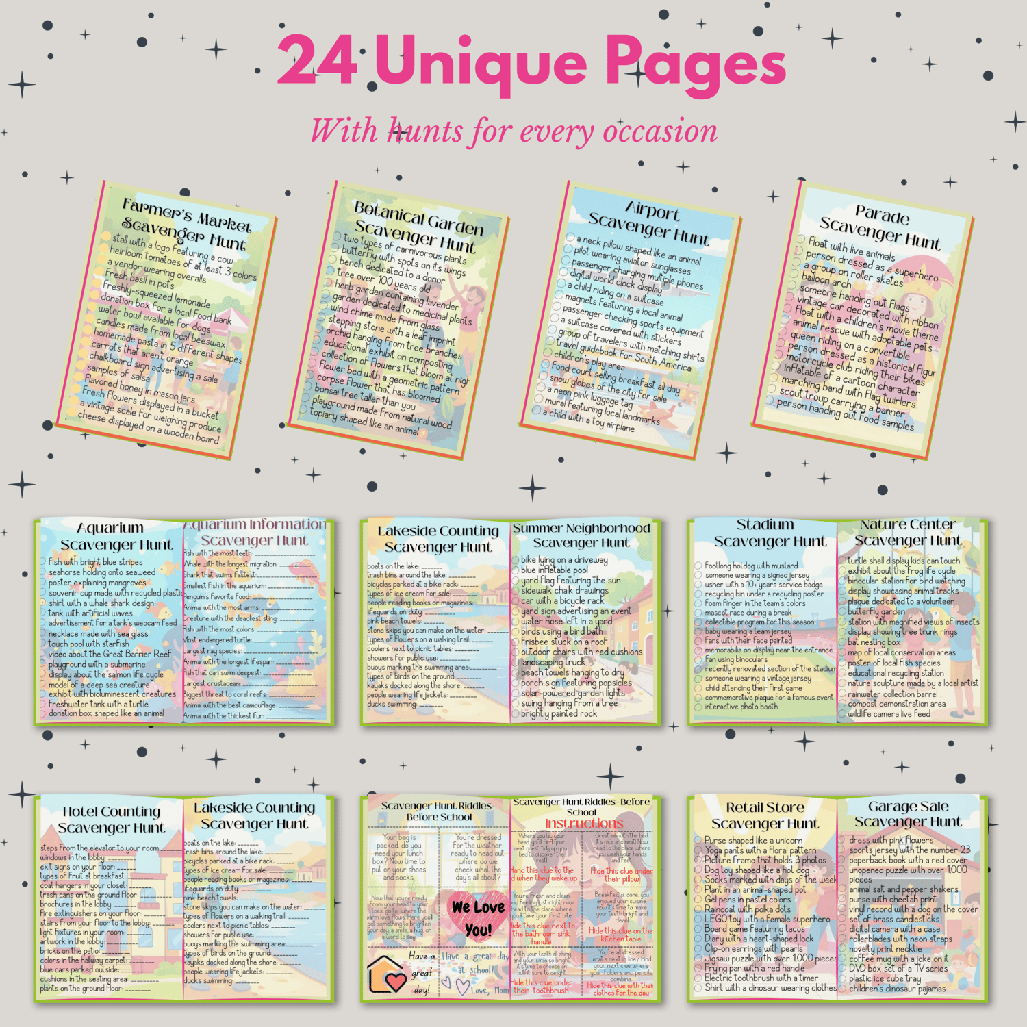 Turn everyday outings into epic adventures with this Kids' Scavenger Hunt Printable Set from Harmonia Designs! Whether you're heading to the farmers market, aquarium, botanical garden, or just hanging out at a garage sale, these 25 themed scavenger hunts are packed with playful challenges the whole family will love.