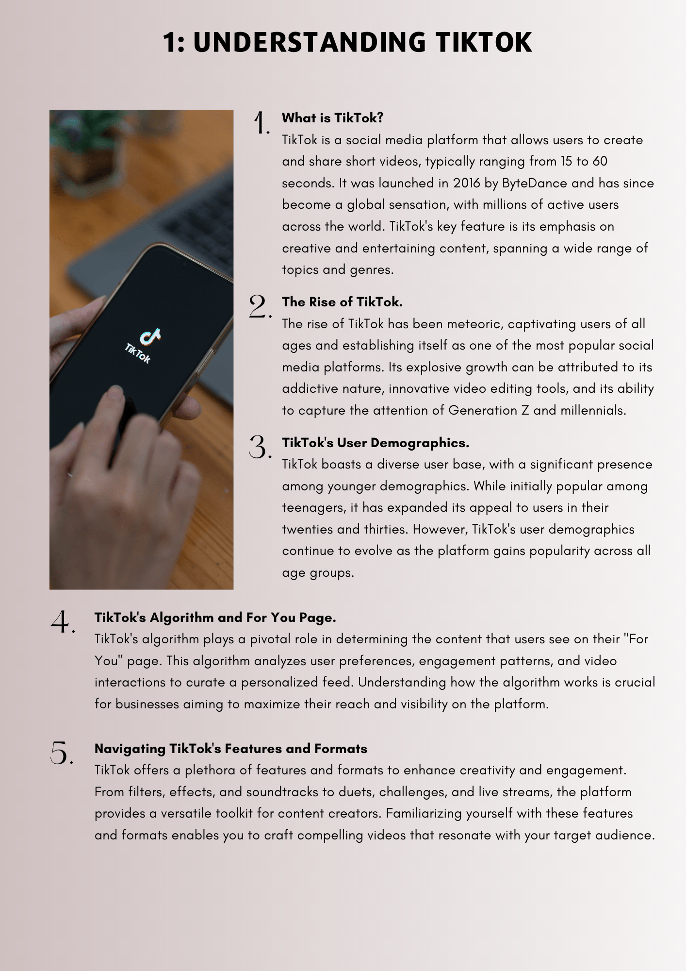 Explore the foundations of TikTok, from understanding its explosive growth to deciphering its algorithm and the coveted For You Page. Gain a deep understanding of why TikTok is a game-changer for businesses, from its global reach and brand-building potential to the effectiveness of influencer marketing.