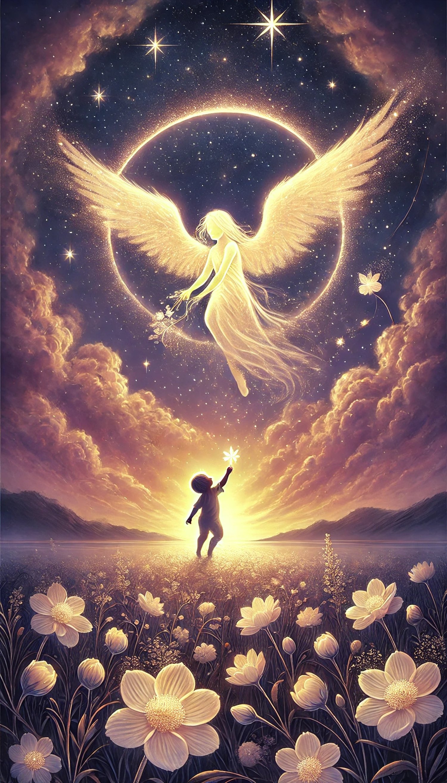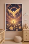 This vertical art print captures the tender moment of an angel guiding a child's soul toward the stars. Surrounded by softly glowing flowers in a twilight sky of gold and lilac, the piece evokes innocence, love, and the quiet beauty of farewell.